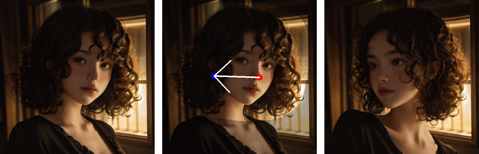 - 交互式精准拖拽:设计师只需在 UI 界面上标记手柄的关键点并拖动至目标位置,DragDiffusion 即可自动计算并执行移动,过程直观如操作矢量图形。