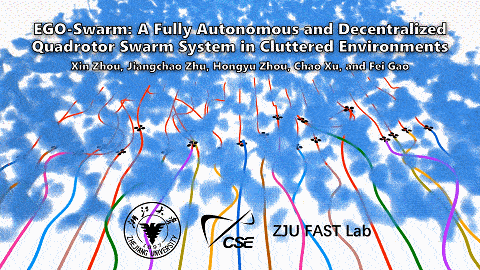 EGO-Swarm:一种完全自主且去中心化的复杂环境四旋翼无人机集群系统,Xin Zhou、Jiangchao Zhu、Hongyu Zhou、Chao Xu 和 Fei Gao(发表于ICRA2021)。论文链接及Science报道。