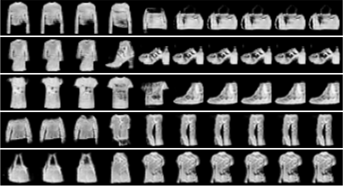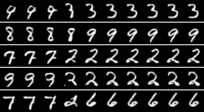 在两个随机潜在向量z之间进行10个随机点的插值,结果显示生成的样本具有平滑的过渡效果。
