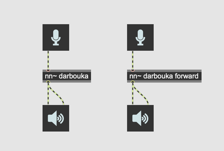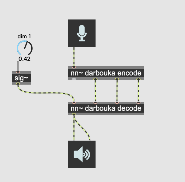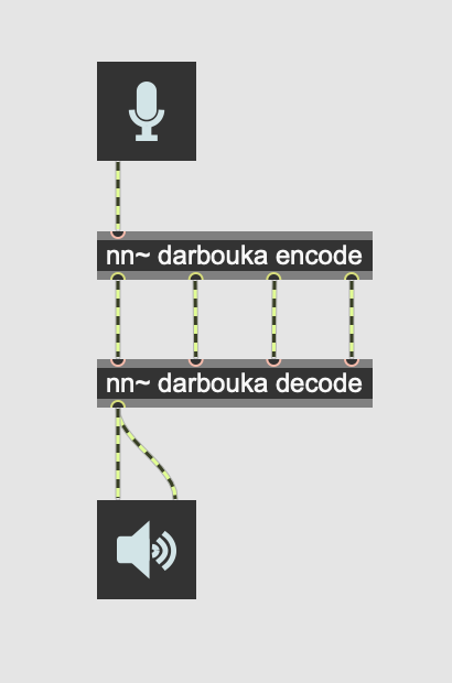 您计算机上可用的名为 darbouka.gin 的预训练 RAVE 模型可以使用以下语法加载到 nn~ 中,其中默认方法设置为前向(即先编码再解码):