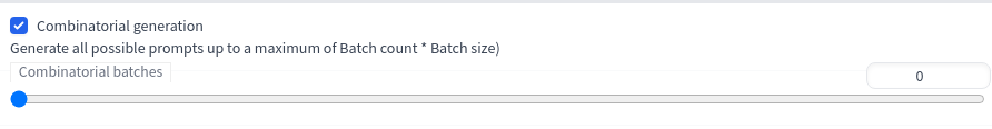 组合生成在您希望为文件中的每位艺术家都生成一张图像时非常有用。可以通过勾选界面中的 Combinatorial generation 复选框来启用此功能。为防止意外生成数千张图片,您可以使用 Max Generations 滑块限制生成的提示总数。默认值为 0,表示不限制。