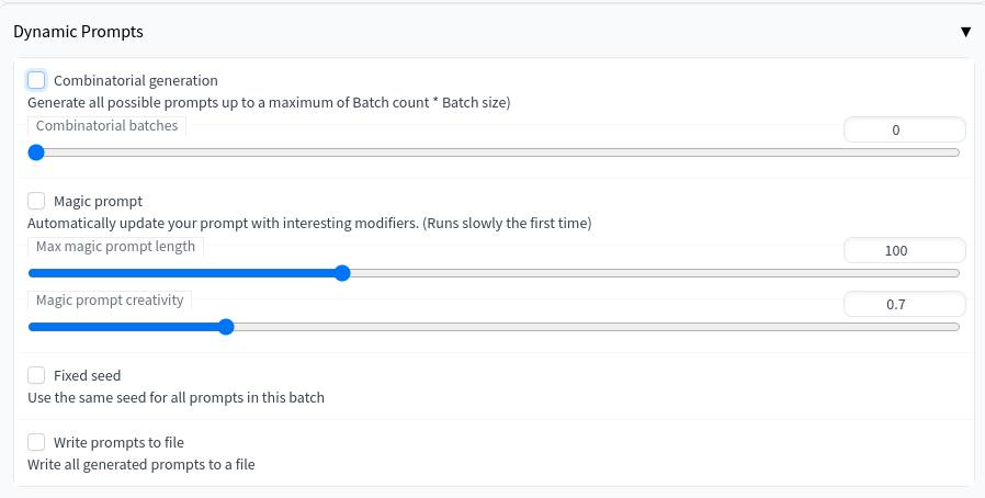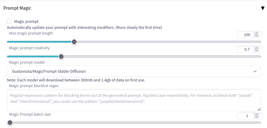您可以通过__最大魔法提示长度__滑块来控制提示的最大长度。__魔法提示创意度__可以调整生成的提示,但您可能需要多次尝试以找到合适的设置。