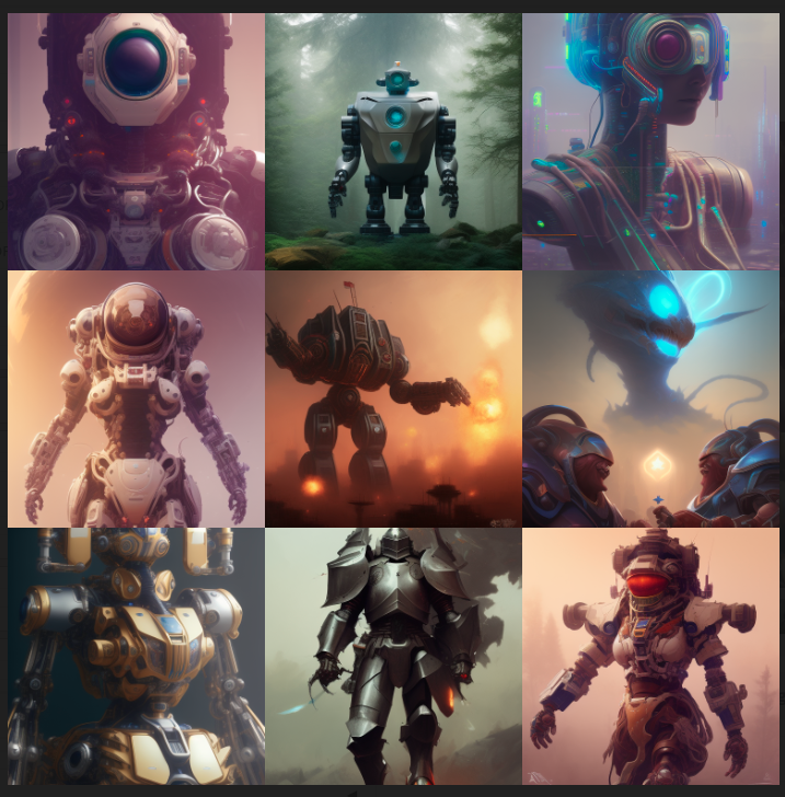使用lexica.art API来创建随机提示。这在您需要灵感或懒得自己思考提示时非常有用。当选择此选项时,主提示框中的内容将被用作搜索字符串。例如,提示“机械战士”可能会返回: