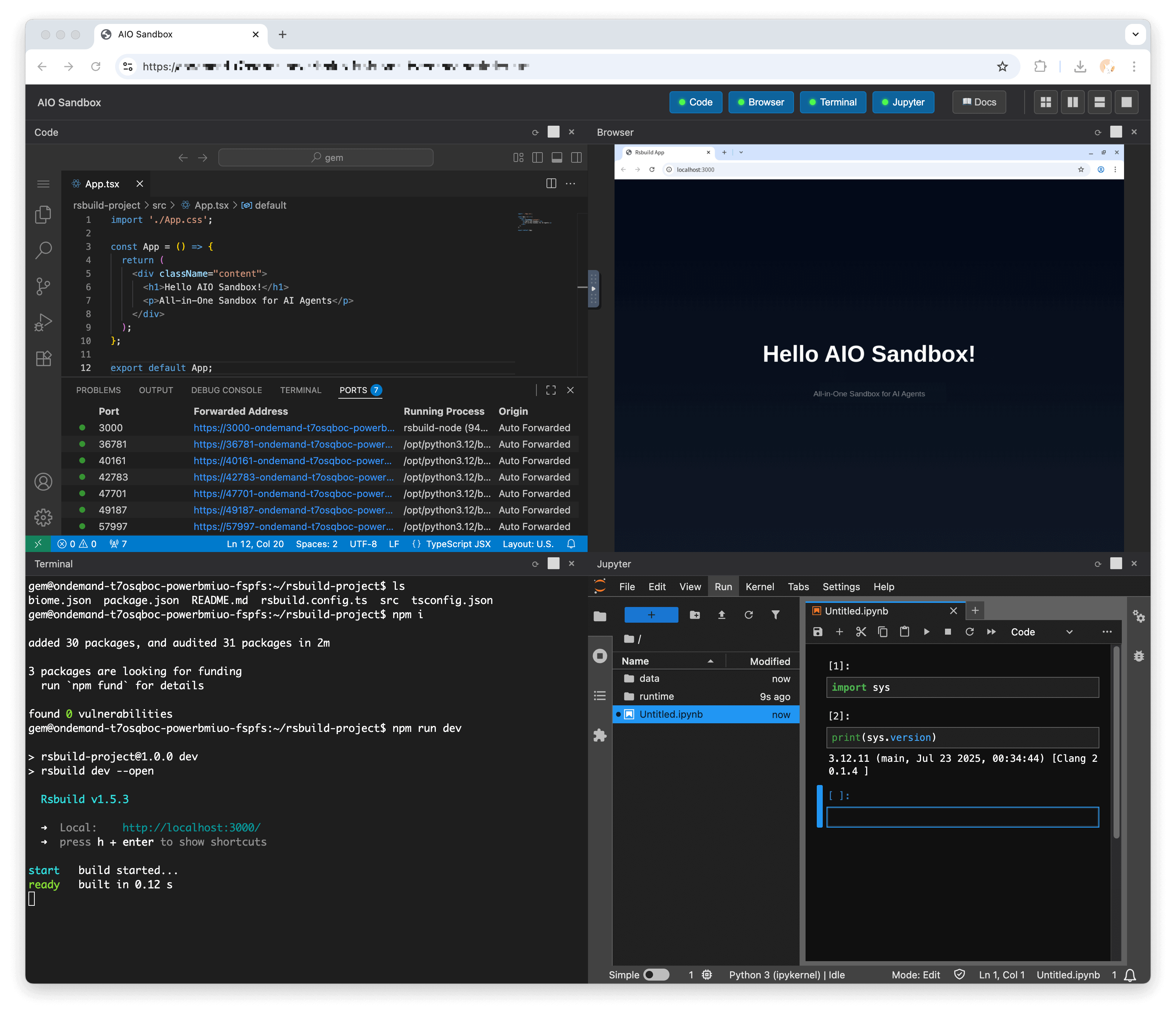 AIO 沙盒是一个多合一的智能体沙盒环境,将浏览器、Shell、文件操作、MCP 服务以及 VSCode Server 集成于一个 Docker 容器中。基于云原生轻量级沙盒技术构建,为 AI 智能体和开发者提供统一且安全的执行环境。