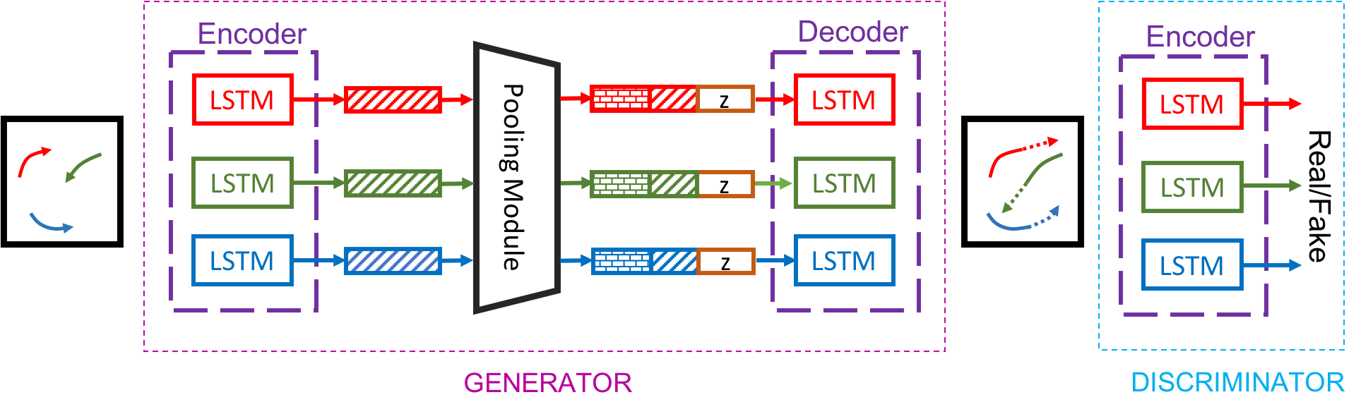 我们的模型由三个关键组件组成:生成器(G)、池化模块(PM)和判别器(D)。生成器基于编码器-解码器框架,通过池化模块将编码器和解码器的隐藏状态连接起来。生成器以场景中所有人的轨迹作为输入,输出相应的预测轨迹。判别器则接收包含输入轨迹和未来预测的完整序列,并将其分类为“真实”或“虚假”。