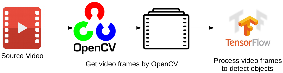 源视频通过 OpenCV 逐帧读取。每一帧都由基于 TensorFlow 开发的 "SSD with Mobilenet" 模型进行处理。这一过程会持续循环,直到视频结束。跟踪器的主要流程如上图所示。