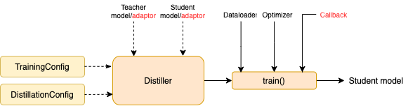 它将模型的输入和输出转换为指定格式,以便蒸馏器能够识别,并计算蒸馏损失。在每个训练步骤中,批次和模型输出都会传递给适配器;适配器会重新组织数据并返回一个字典。