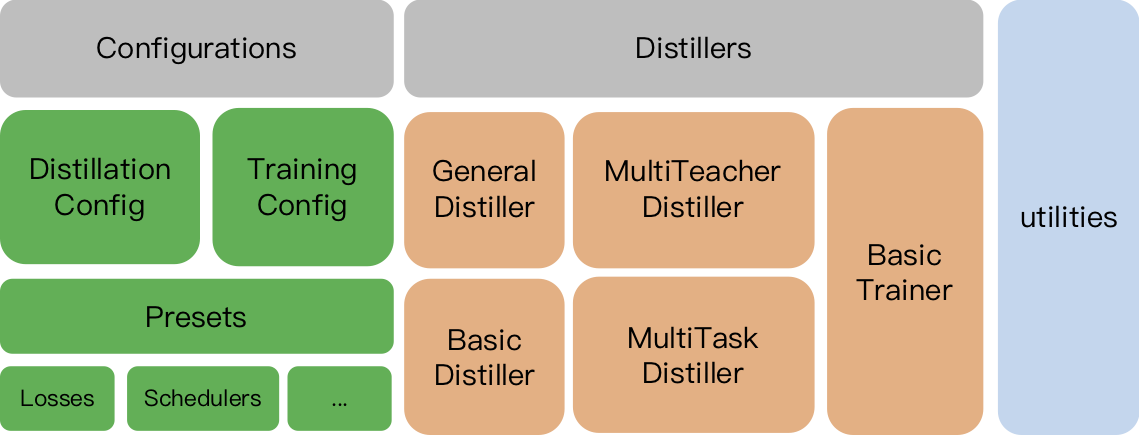- 灵活性:用户可以通过组合不同的技术来自定义蒸馏方案;同时支持自定义损失函数、模块等。