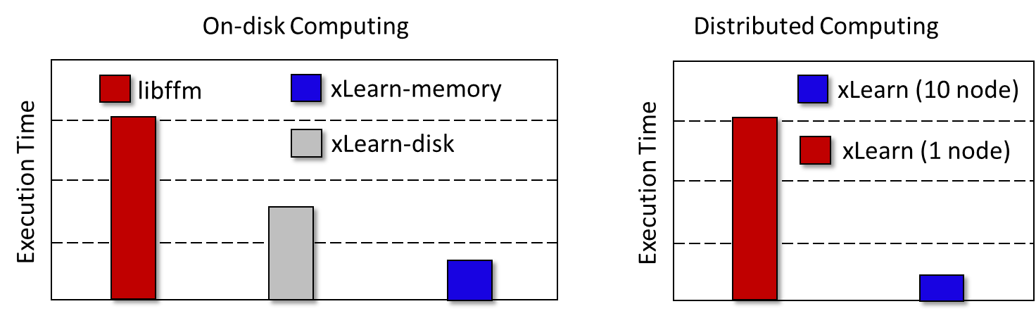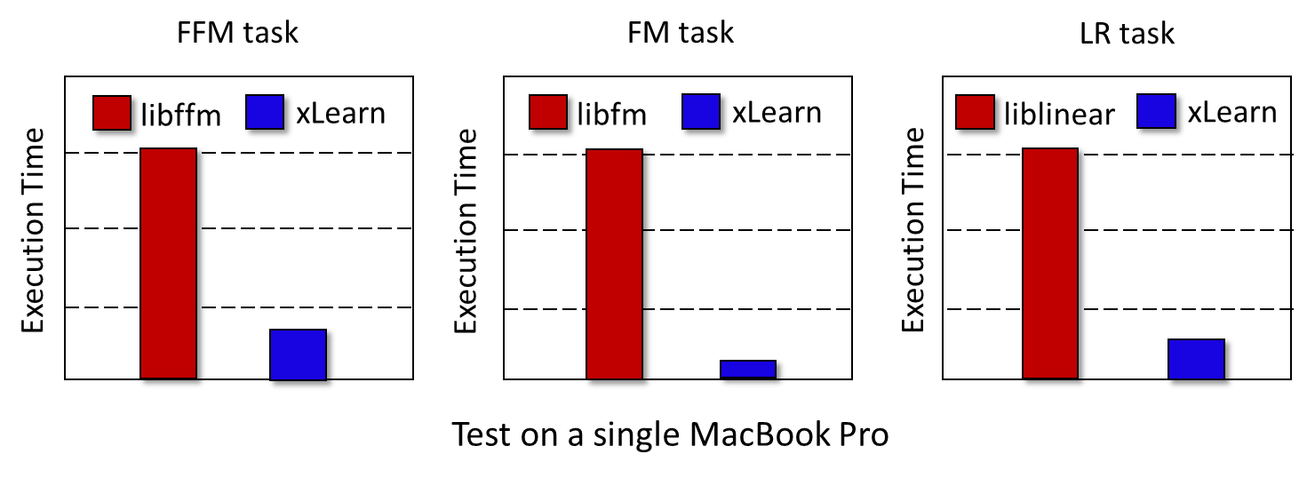 xLearn基于高性能的C++代码开发,并经过精心设计与优化。我们的系统旨在最大化CPU和内存的利用率,提供缓存友好的计算方式,并支持无锁学习。通过结合这些技术优势,xLearn相比同类系统性能提升了5到13倍。