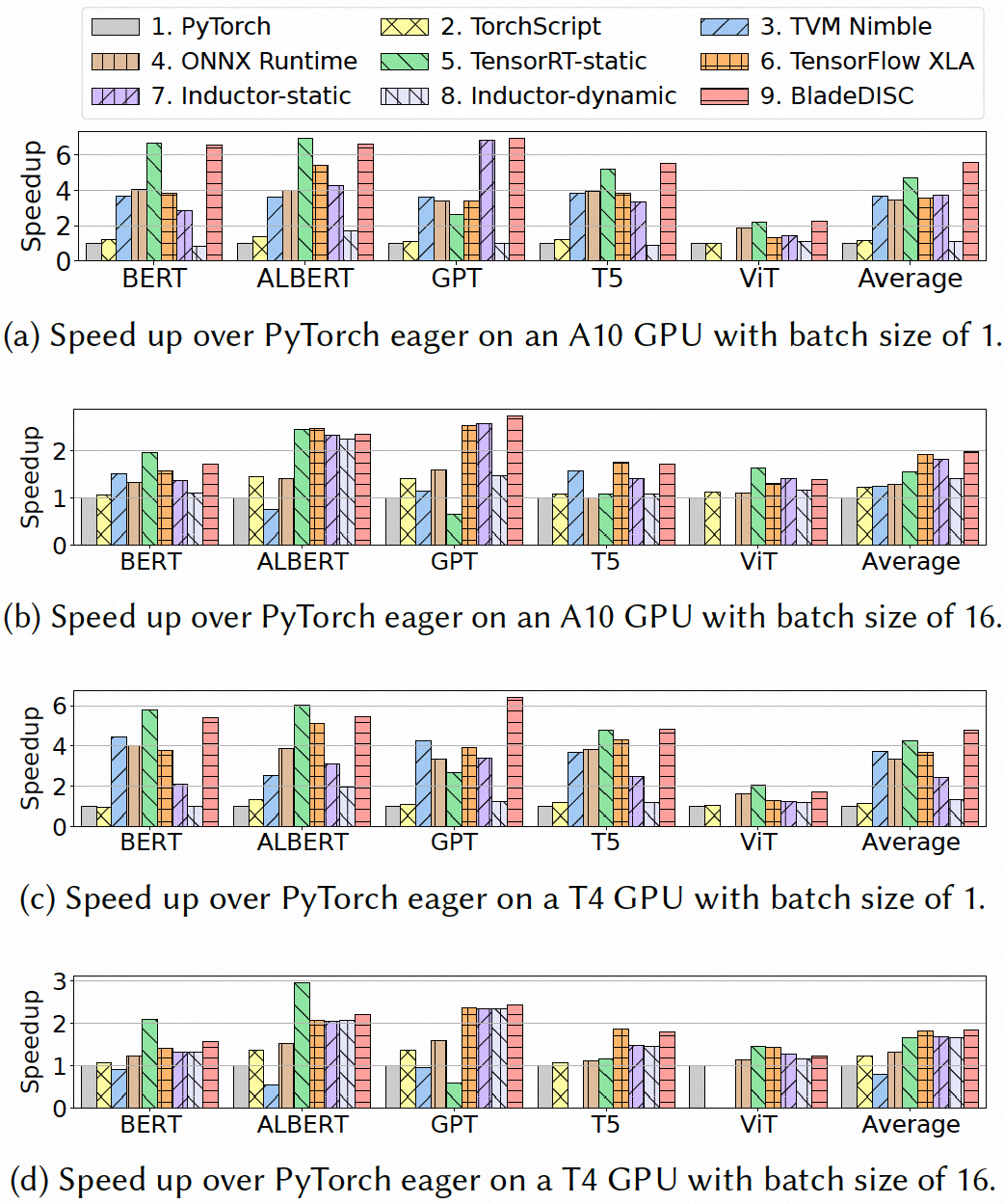 通过对一组用于生产的典型机器学习工作负载进行评估,BladeDISC 相较于 PyTorch 最高可实现 6.95 倍的加速。此外,与静态优化编译器(如 XLA 和 TensorRT)相比,BladeDISC 表现出相当甚至更好的性能。