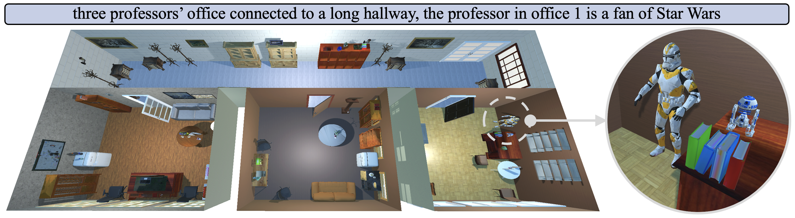 - 人工建模成本极高:美术人员需手动在 Unity 或 Blender 中逐个搭建房间,耗时数天才能完成一个高质量场景,难以满足大规模训练需求。
