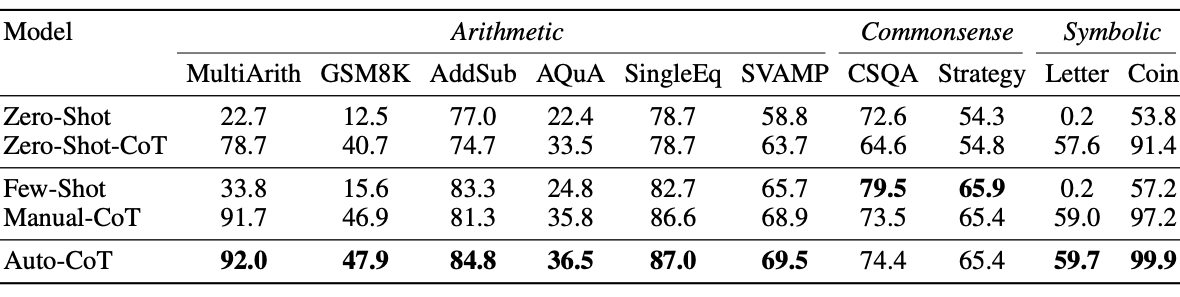 Auto-CoT 通过更多的鼓励和多样性,大幅节省了思维链提示设计中的大量手动工作,在 GPT-3 上的表现甚至可以媲美或超越人工设计的提示。
