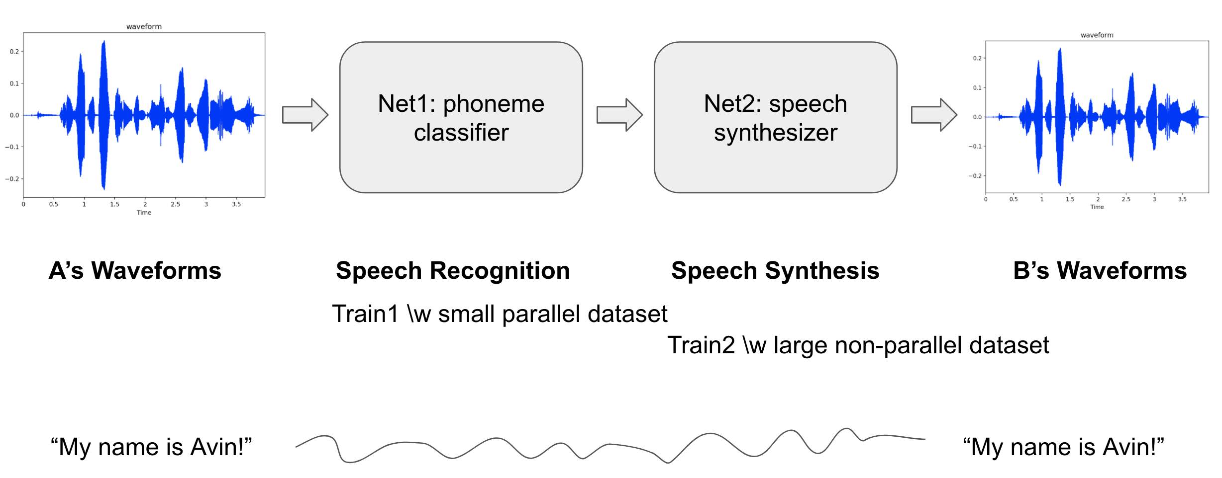 这是一个多对一的语音转换系统。这项工作的主要创新之处在于,我们仅需目标说话者的波形数据,而无需像“源音频、目标音频”、“音频、文本”或“音频、音素”这样的平行数据集即可生成目标说话者的语音。事实上,构建这些平行数据集通常需要耗费大量精力。而在本项目中,我们只需要目标说话者的一系列语音波形,以及少量匿名说话者的“音频、音素”对。