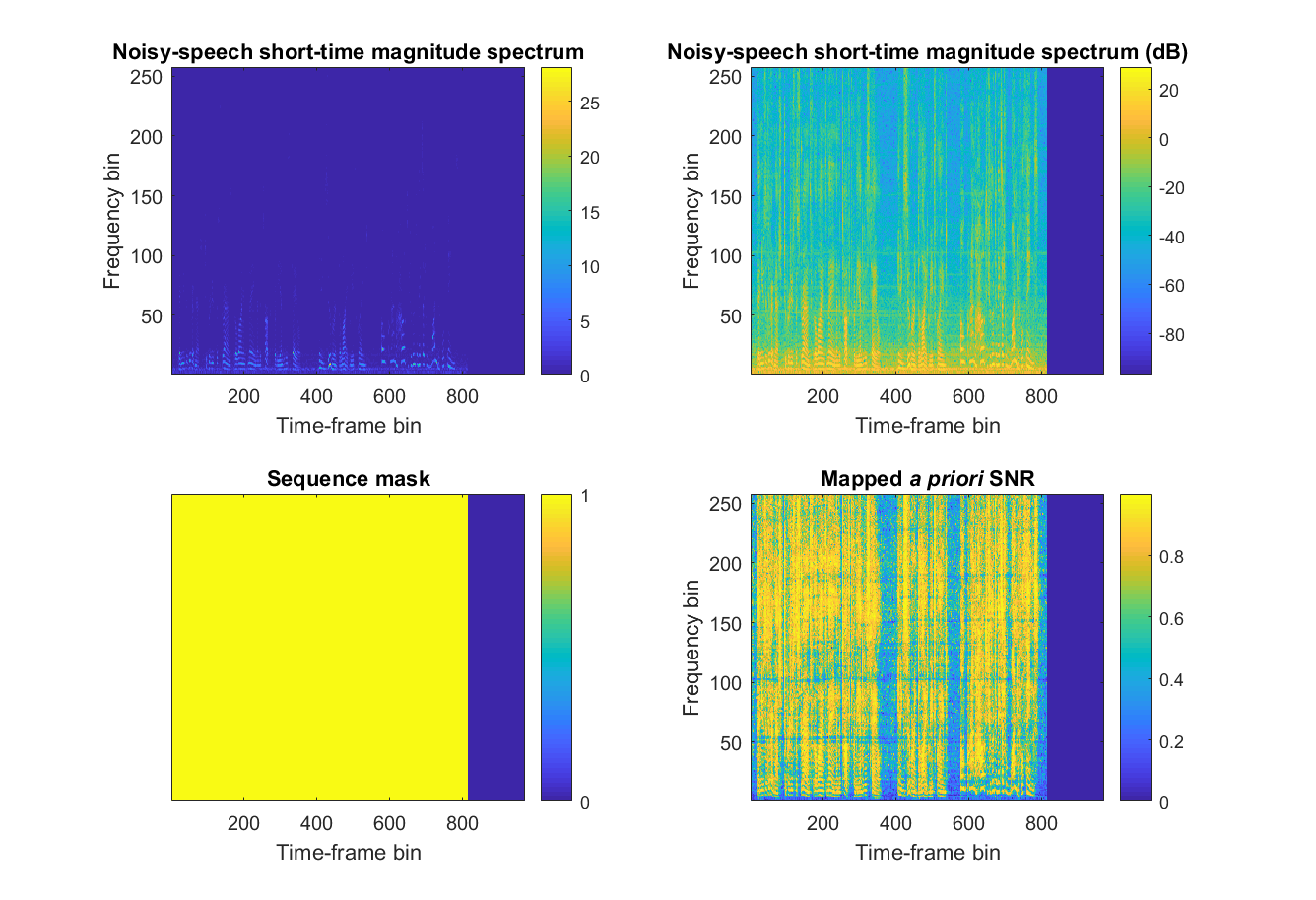 图 2 展示了一个训练示例。Deep Xi 框架内的深度神经网络 (DNN) 将 噪声语音的短时幅度谱 作为输入。该 DNN 的训练目标是瞬时先验信噪比的映射版本(即 映射后的先验信噪比)。为了提高所使用的随机梯度下降算法的收敛速度,瞬时先验信噪比被映射到区间 [0,1]。这种映射是瞬时先验信噪比的累积分布函数 (CDF),具体公式见 [1] 中的式 (13)。CDF 的统计信息是在训练集的一个样本上计算得出的。每个频段样本的均值和标准差示例如 图 3 所示。每个小批量中的训练样本都会被填充到该批量中最长序列长度。TensorFlow 使用 序列掩码 来确保 DNN 不会基于填充部分进行训练。在推理阶段,先验信噪比估计值通过使用样本统计信息和 [2] 中的式 (12),由映射后的先验信噪比反推得出。