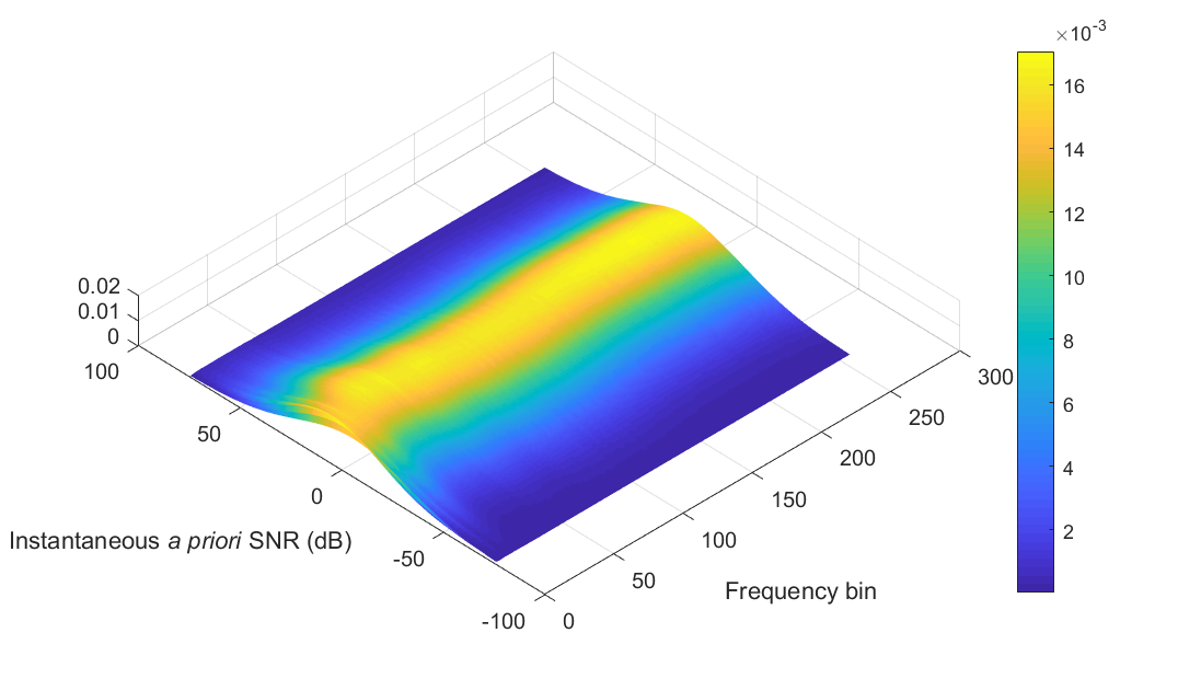 图 3: 每个频段的正态分布是根据训练集中瞬时先验信噪比(dB)的均值和标准差计算得出的。由 |