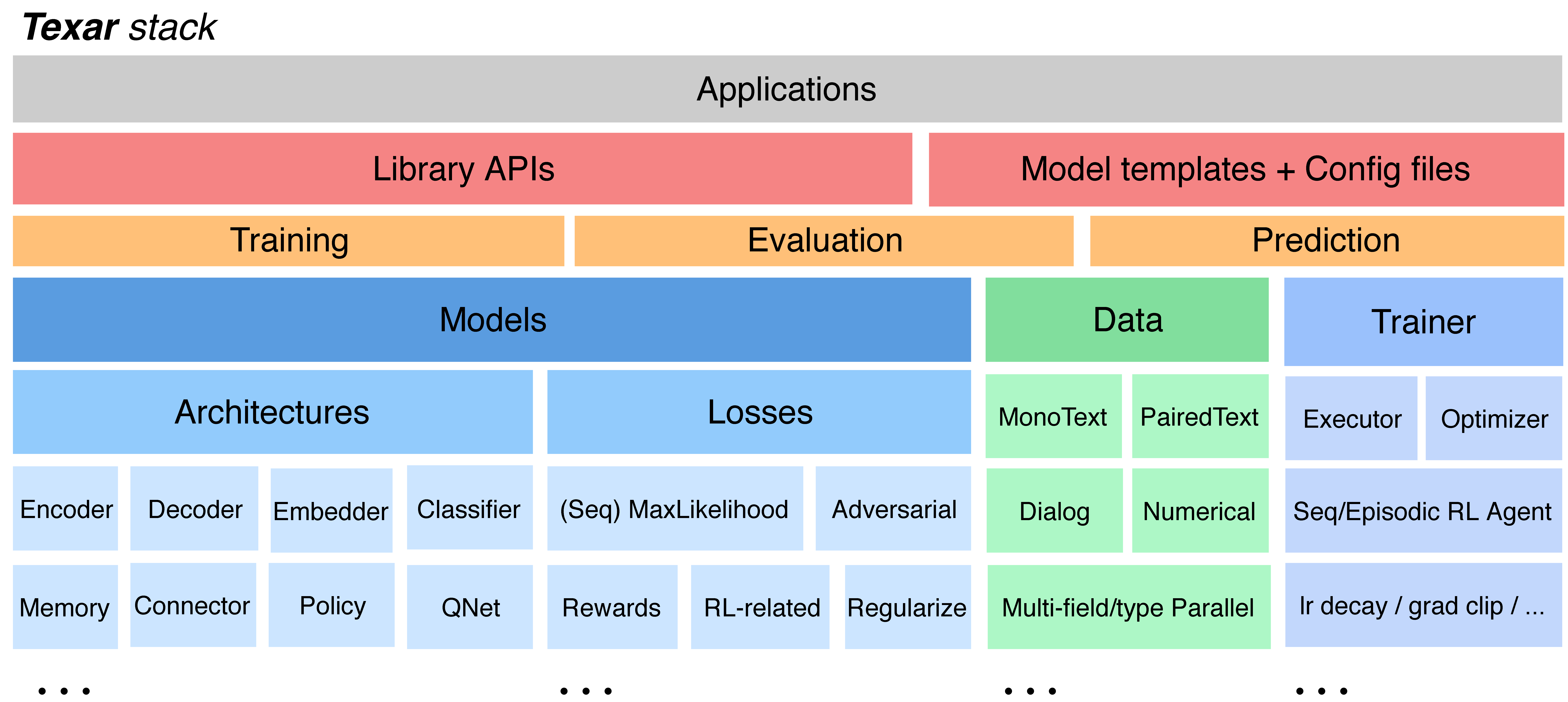 - 两个版本,接口基本一致。Texar-TensorFlow(本仓库)和 Texar-PyTorch 的接口几乎完全相同。两者进一步结合了 TensorFlow 和 PyTorch 的最佳设计: