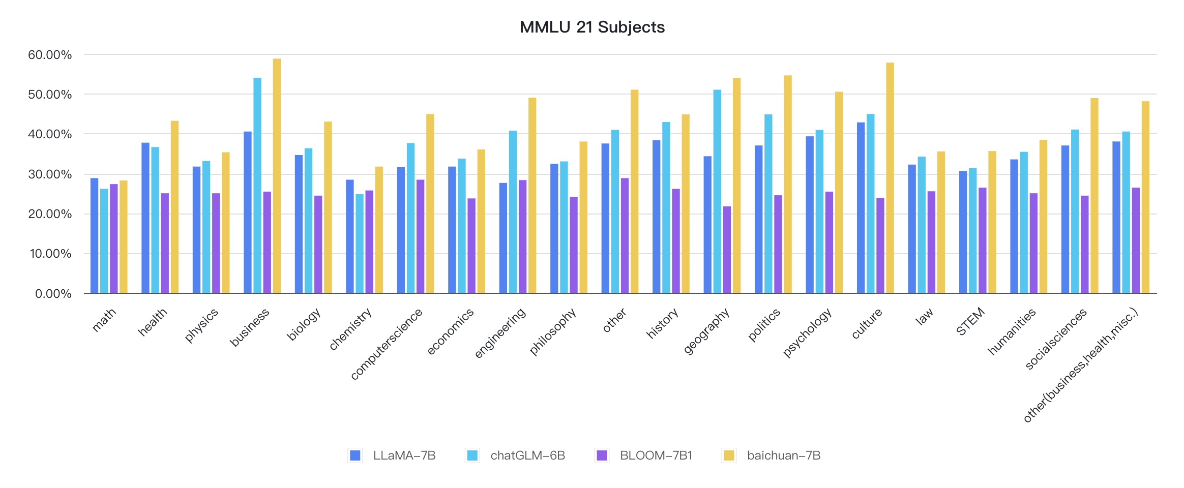 除了中文之外,Baichuan-7B也测试了模型在英文上的效果,MMLU 是包含 57 个多选任务的英文评测数据集,涵盖了初等数学、美国历史、计算机科学、法律等,难度覆盖高中水平到专家水平,是目前主流的LLM评测数据集。我们采用了开源 的评测方案,最终 5-shot 结果如下所示: