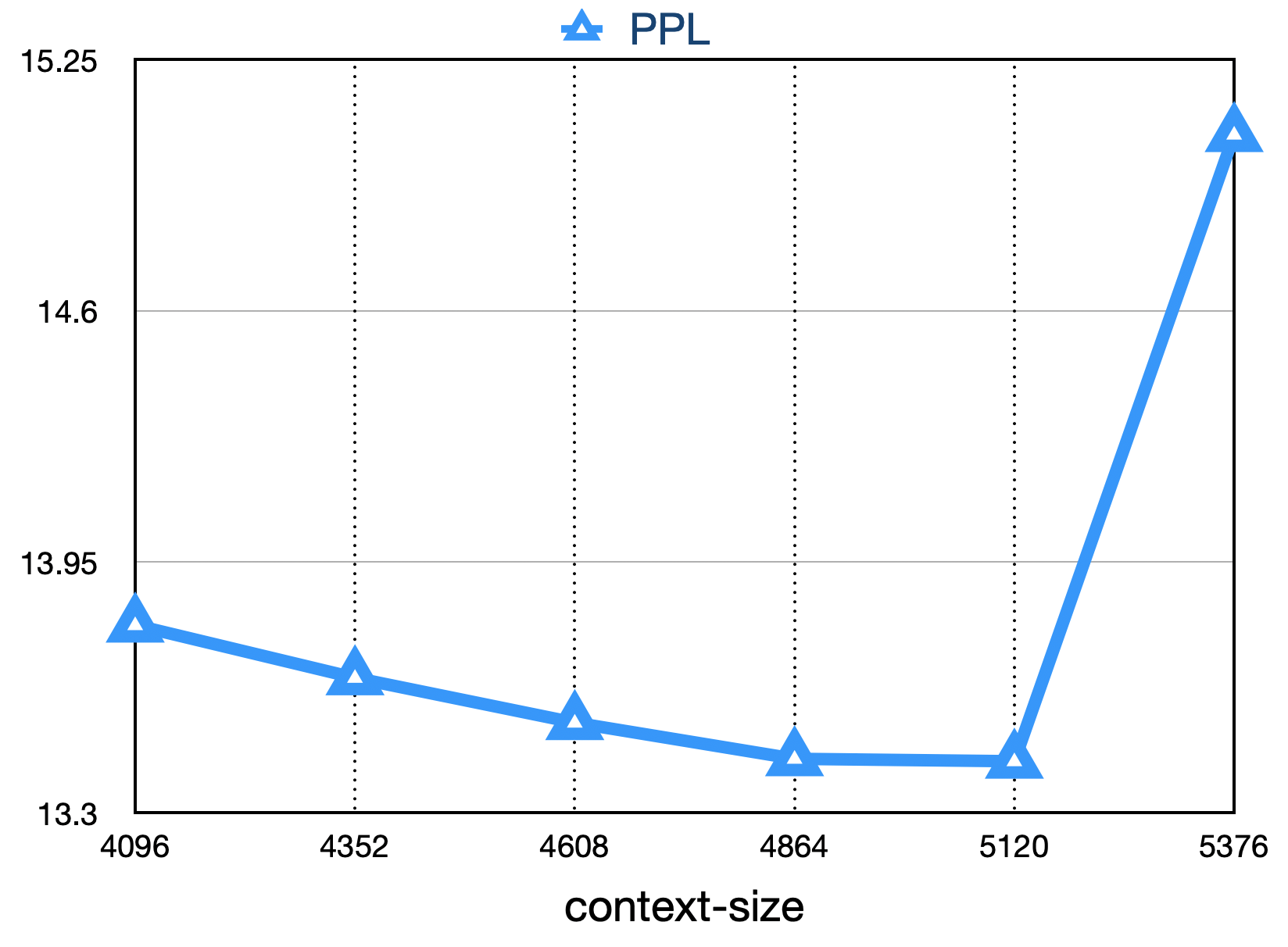 - 位置编码:rotary-embedding 是当前主流模型广泛采用的位置编码方案,具有更好的外推性能。虽然训练过程中最大长度为 4096,但在实际测试中,模型可良好扩展至 5000 tokens 以上,如下图所示: