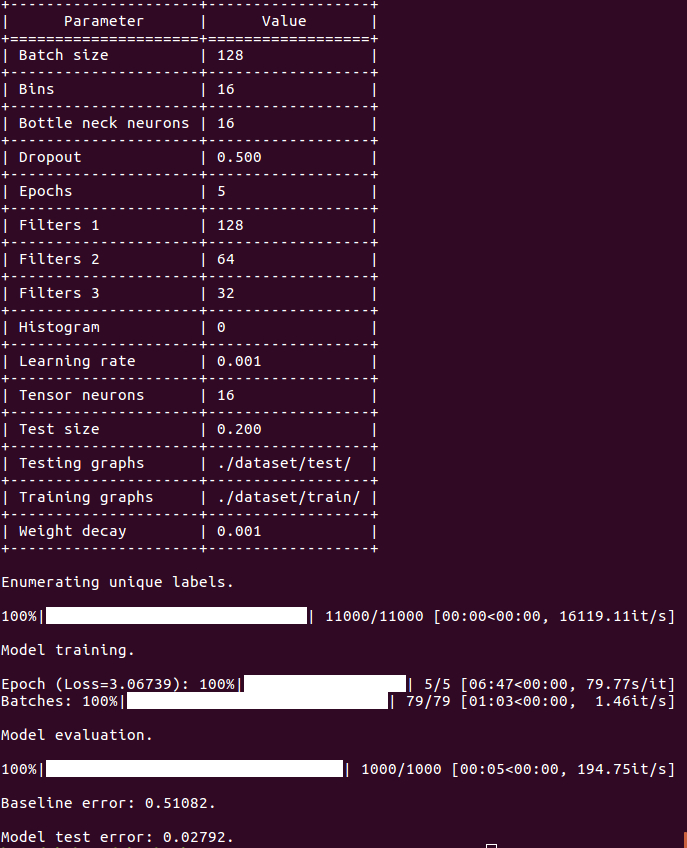 以下命令用于训练神经网络并在测试集上进行评分。在默认数据集上训练 SimGNN 模型。