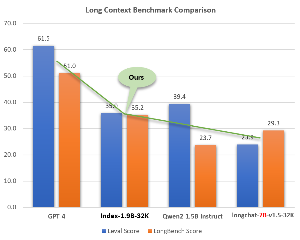 尽管规模较小(约为 GPT-4 等模型的 2%),Index-1.9B-32K 却展现出卓越的长文本处理能力。 如图所示,我们的 19 亿参数模型得分甚至超过了 70 亿参数的模型。以下是与 GPT-4、Qwen2 等模型的对比: