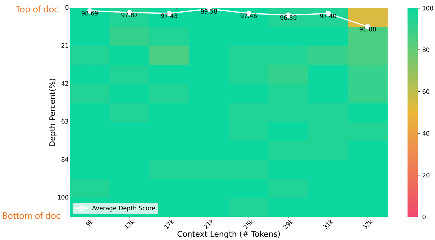 在 32K 长度的“大海捞针”测试中,Index-1.9B-32K 取得了优异的成绩,如下图所示。唯一的例外是在 (32K 长度, 10% 深度) 区域出现了一个小小的黄色区域(91.08 分),其他大部分区域都表现良好,呈现绿色。