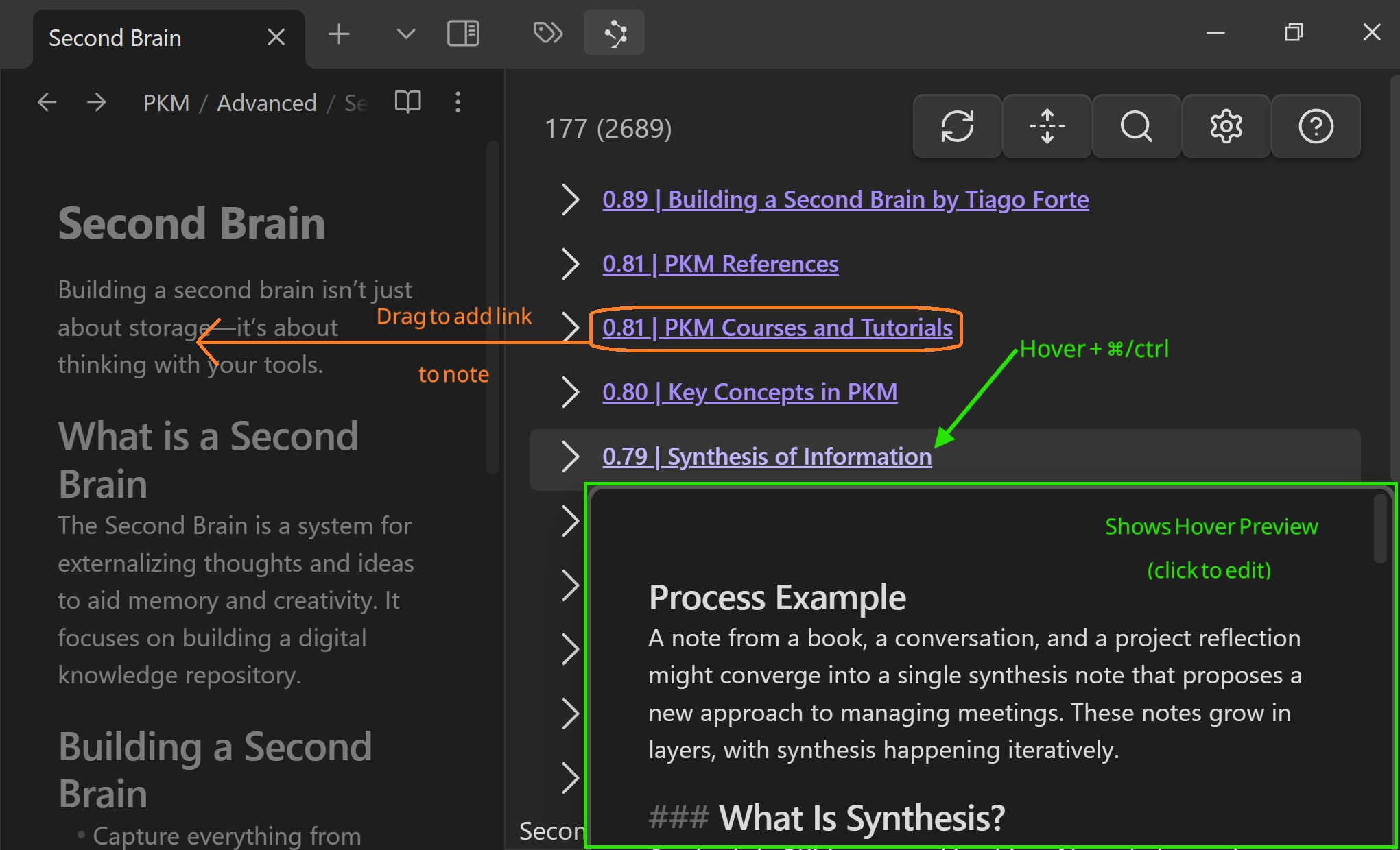 - 将某个结果拖拽到笔记中即可创建链接。