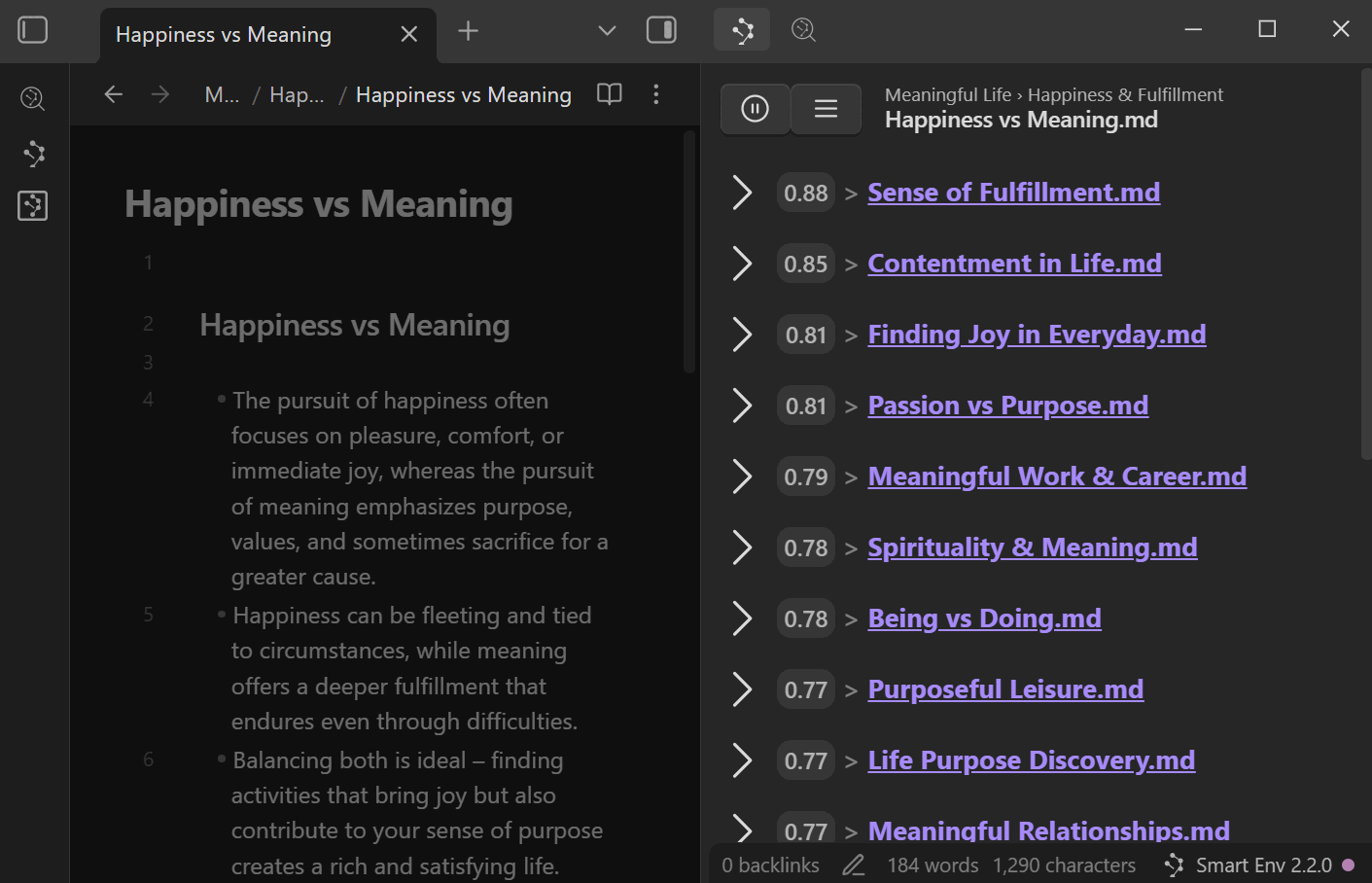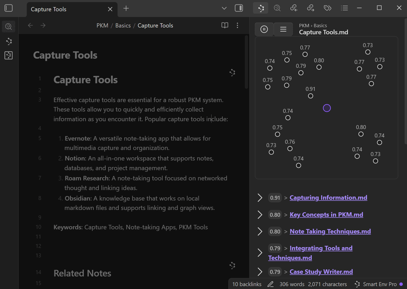 Smart Connections 是一个更广泛的“本地优先、用户导向”工具生态系统中的组成部分。 我开发 Smart 插件是为了探索新想法、实现实用的工作流,并在 Obsidian 内部保持复杂度的可控性。而 Smart Connections 则负责处理笔记之间的连接关系。