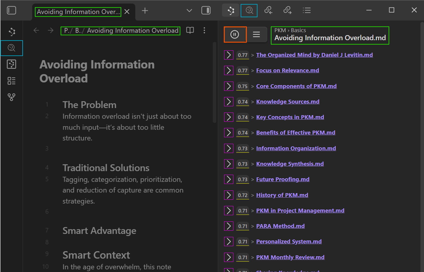 [!QUESTION] 你是否也有这样的困扰? 你是 Obsidian 的高级用户、研究者、作家或终身学习者,拥有 成百上千条笔记。你习惯快速记录想法,但到了真正需要使用这些信息时,却常常难以找到并建立它们之间的联系。
