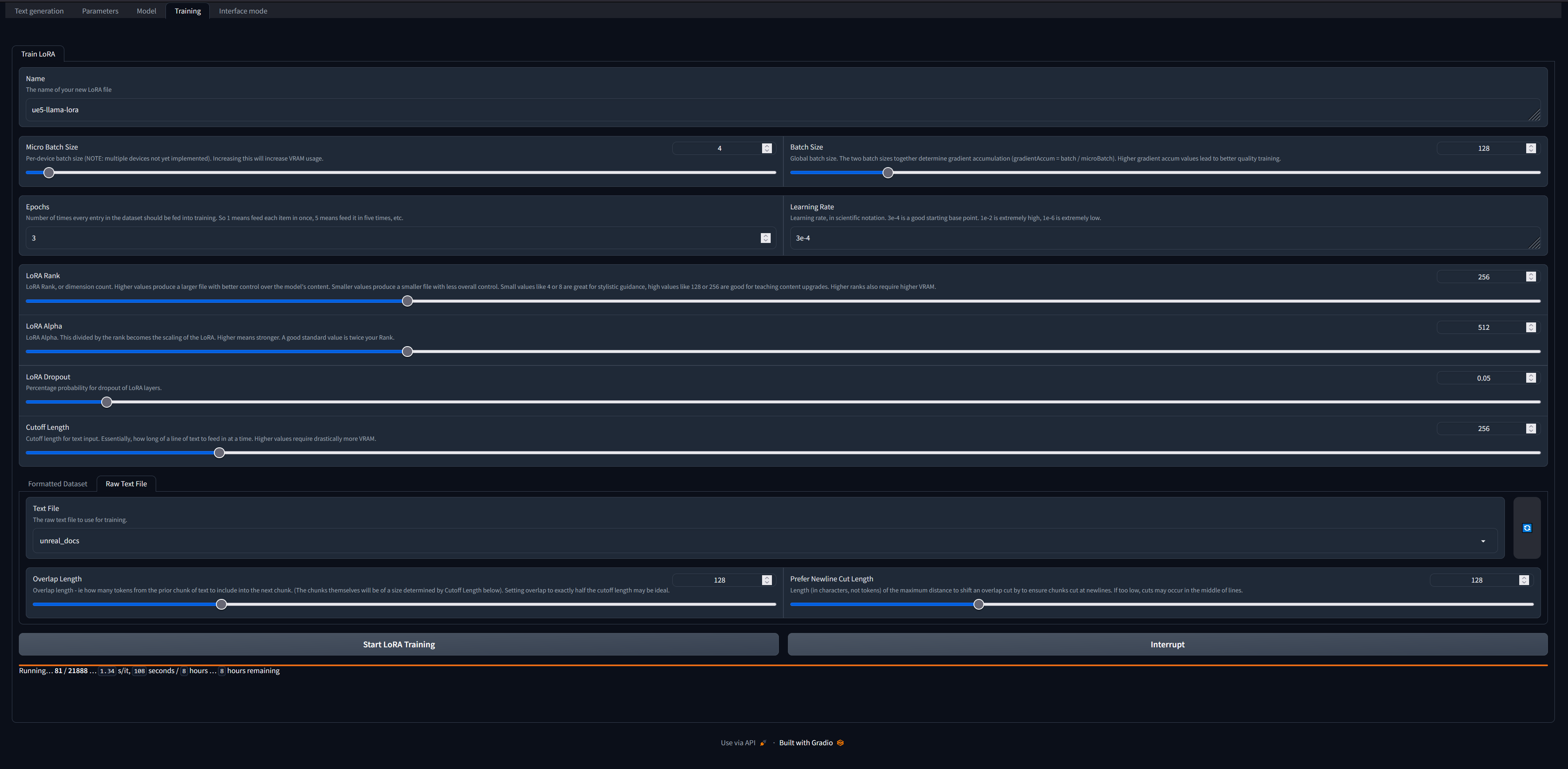 你需要先设置好oobabooga的文本生成WebUI,这是一款非常优秀的工具,旨在成为本地运行和训练大型语言模型领域的“Stable Diffusion WebUI”版本。当然,你也可以通过其他方式训练LoRA,但我采用的就是这种方法。如果你使用的是Windows系统,新版的一键安装程序会非常有帮助。安装完成后,你需要选择一个基础模型。我使用的是以8位模式加载的Llama-7b,但其他模型也应该可以工作。从本仓库下载unreal_docs.txt文件,并将其放入text-generation-webui/training/datasets目录下。然后切换到WebUI中的训练选项卡,配置相关设置:
