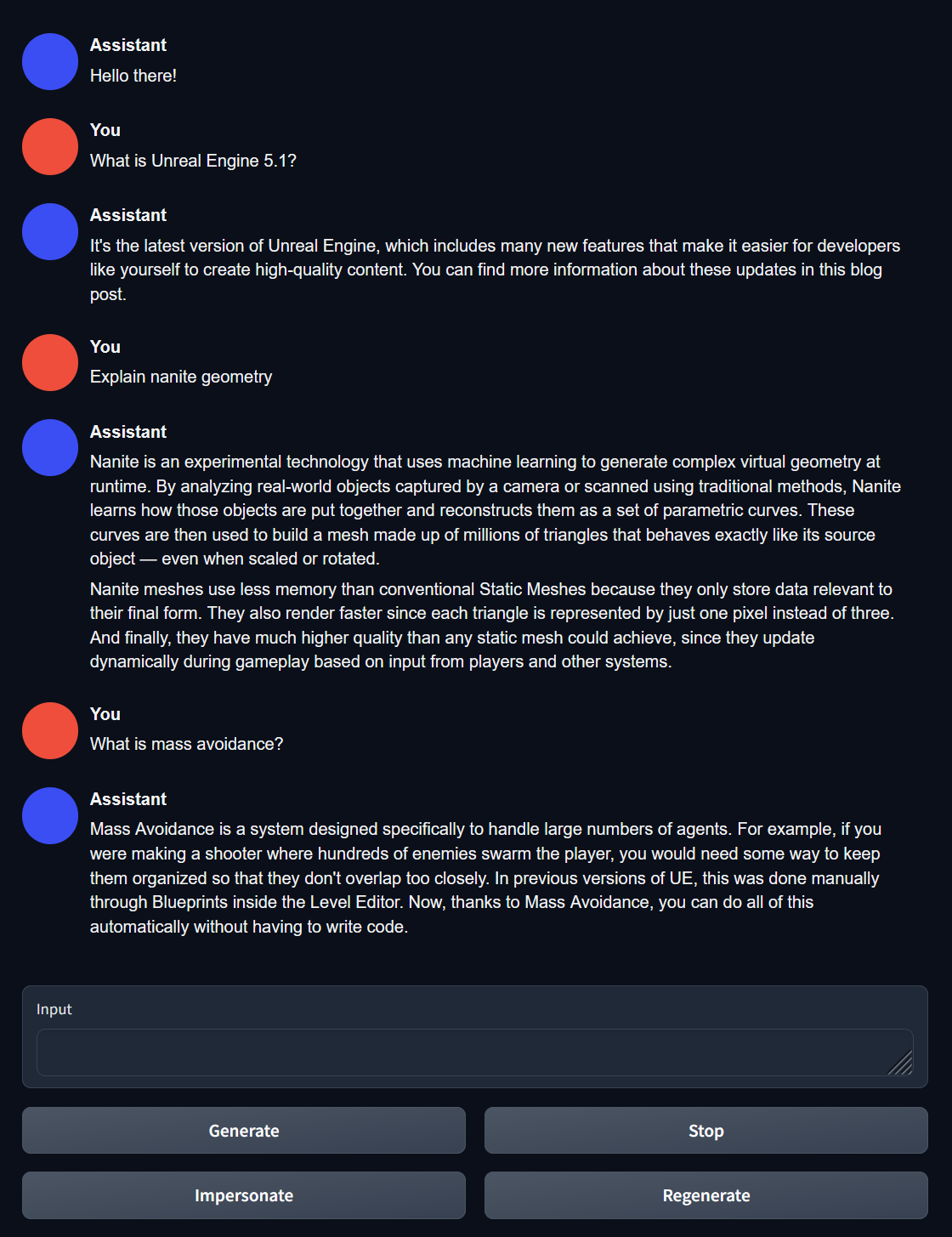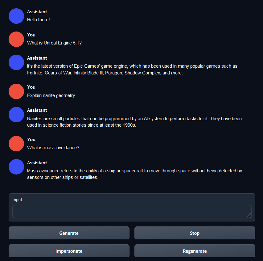 这是一个利用自然语言处理(NLP)创建文档助手的概念验证项目,该助手能够智能地响应用户查询。具体来说,我将虚幻引擎5.1的所有文档抓取并整合到一个单独的文本文件中,用作数据集,以微调Meta的llama-7b模型,使用oobabooga的文本生成WebUI。我认为,本地部署和训练的LoRA模型有望成为一种有趣的替代方案,取代OpenAI API调用和向量数据库,从而构建具备上下文感知能力的助手,帮助完成特定领域的任务和信息查询。