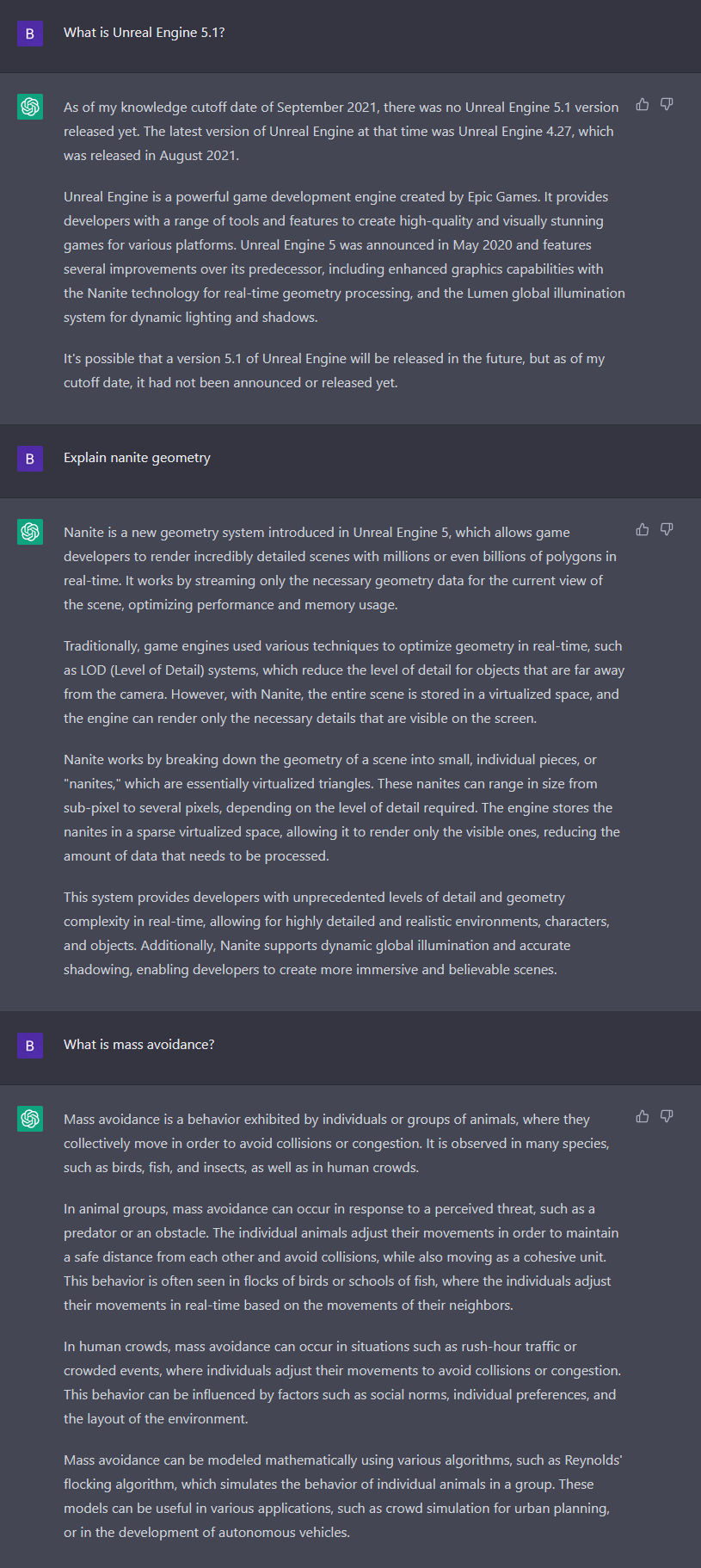 显然,基础Llama 7b对当前情况一无所知,无法提供关于虚幻引擎5及其新功能的信息。然而,当它结合了ue5-llama-lora后,便能生成高质量的回答,这些回答明显源自于虚幻引擎5.1的最新文档。尽管虚幻引擎5是在ChatGPT的训练截止日期之后发布的,但它对Nanite技术却表现出惊人的熟悉度,因为Nanite早在2021年9月之前就已经被宣布过了。不过,ChatGPT未能识别虚幻引擎中的大规模避障功能,因为这是引擎中一项更新的实验性功能。