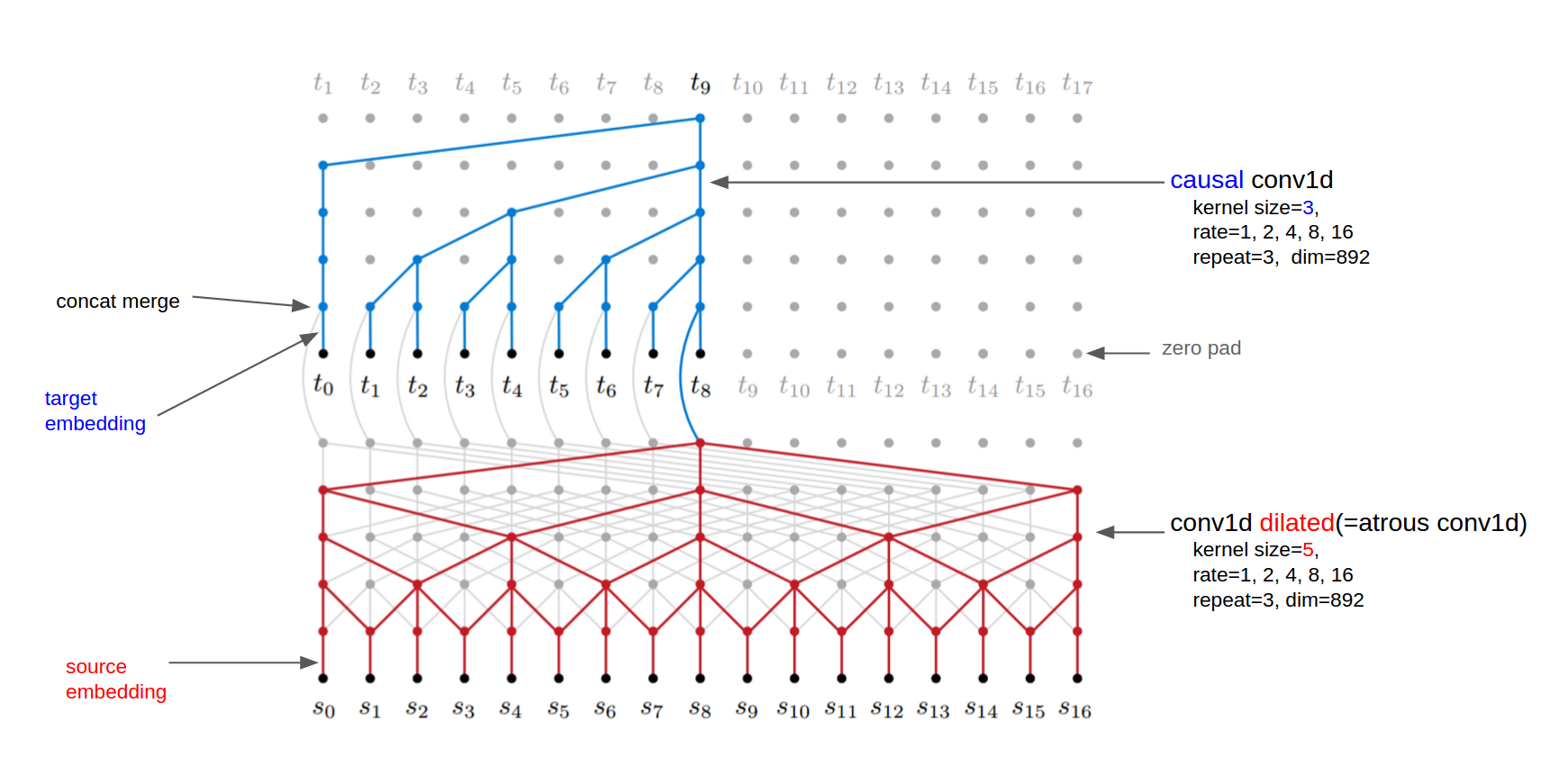 - 线性时间加速:ByteNet 利用扩张因果卷积(dilated causal conv1d)替代循环神经网络,实现并行计算,将翻译速度提升至线性级别,显著降低延迟。