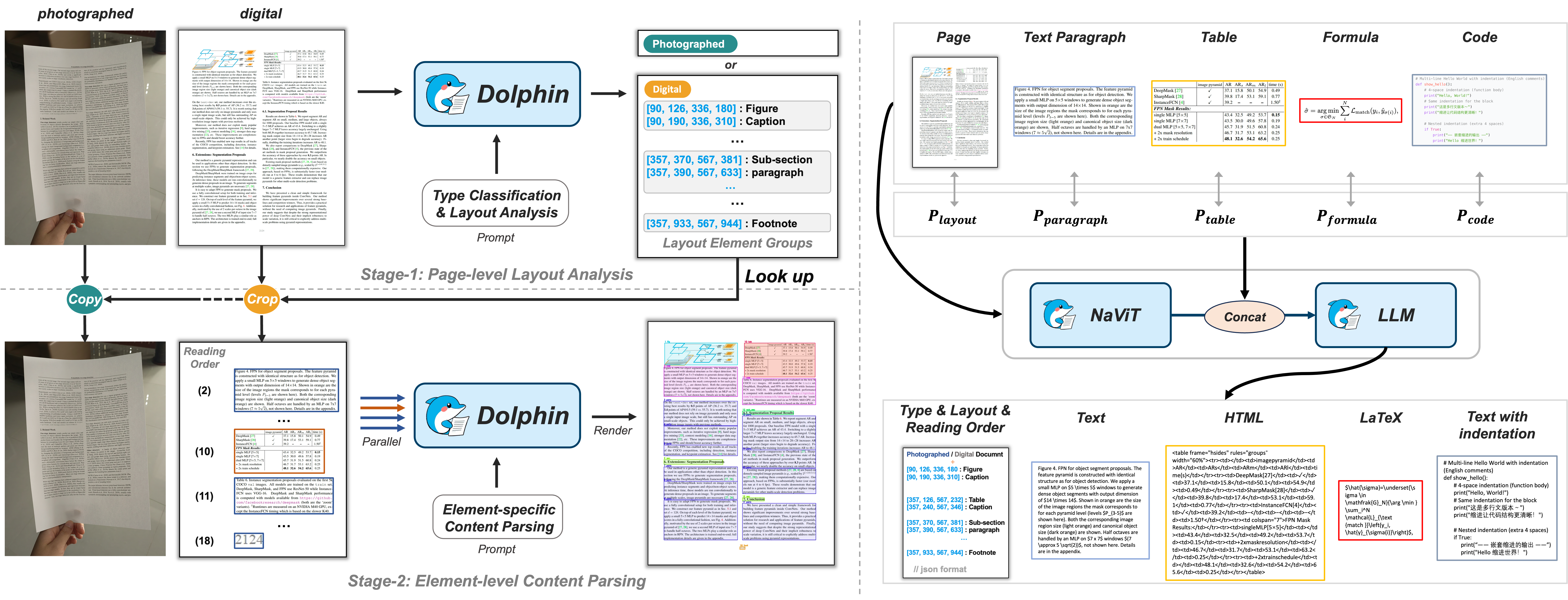 文档图像解析具有挑战性,因为文档类型多样,且文本段落、图片、公式、表格和代码块等元素复杂交织。Dolphin-v2 通过一种文档类型感知的两阶段方法来解决这些挑战: