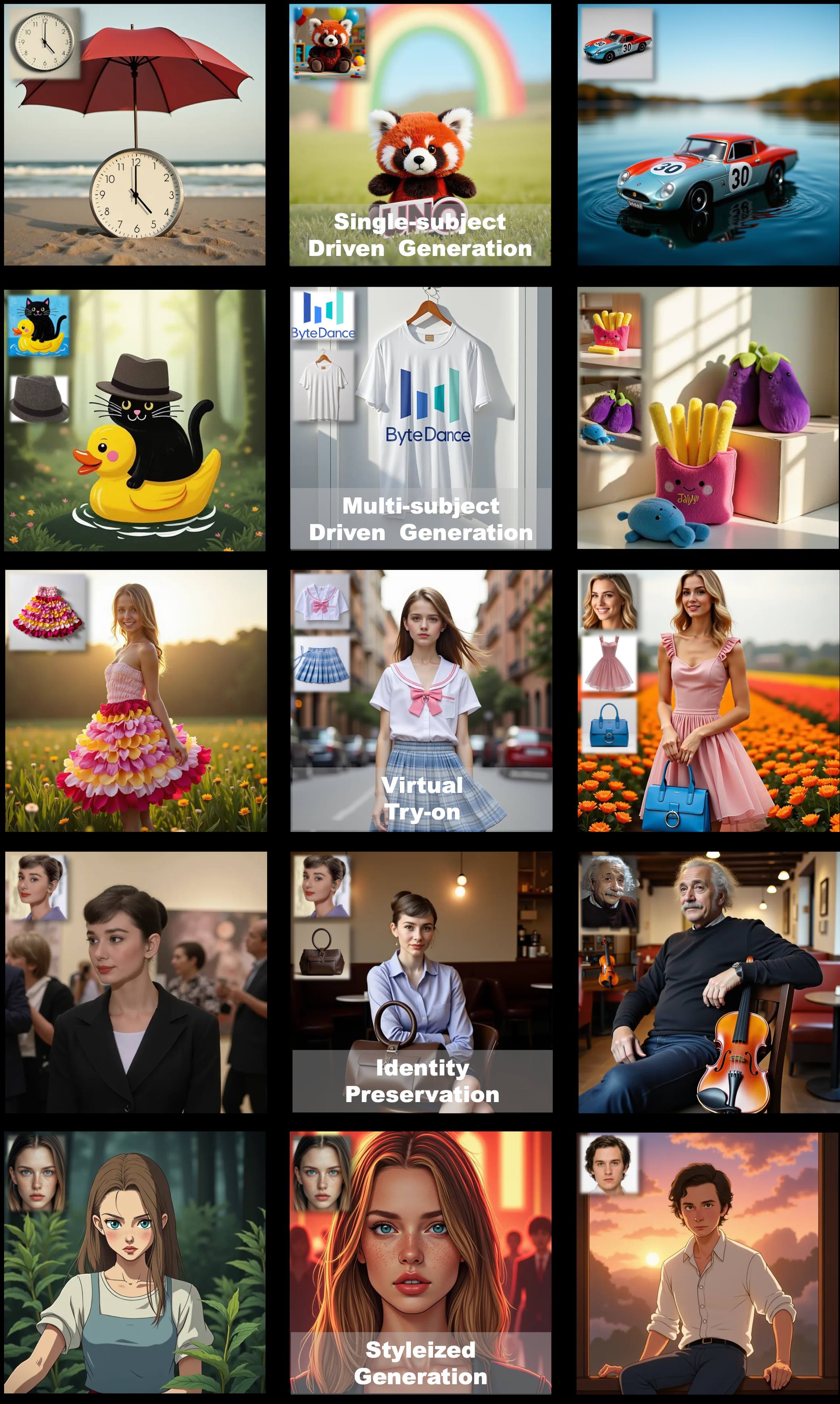 - 2025.08.29 🔥 我们很高兴地分享我们的新开源项目 USO,它可以在任何场景中自由组合任意主体与任意风格,同时确保照片级逼真的效果。你还可以访问我们的 项目页面 或尝试 在线演示 以获取更多示例。🔥