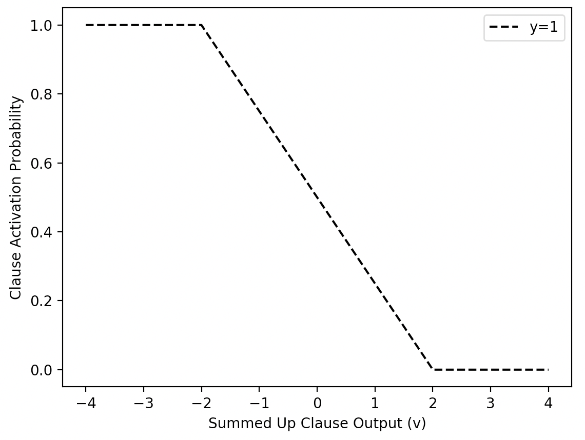 。其中一半的子句被赋予正极性,另一半则被赋予负极性。随后,这些子句的输出通过求和并使用单位阶跃函数