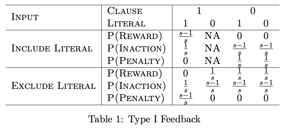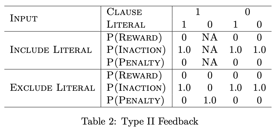 包含或排除在子句之外(见上图)。学习如何选择包含哪些文字是基于强化学习:I型反馈会产生频繁模式,而II型反馈则会增强模式的区分能力。