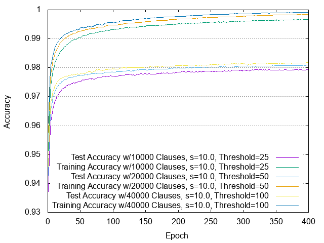 下图展示了特茨林机在二值化但未进行其他增强处理的MNIST数据集(https://en.wikipedia.org/wiki/MNIST_database)上的平均学习进度(基于50次运行)。更多信息请参见:https://github.com/cair/fast-tsetlin-machine-with-mnist-demo。