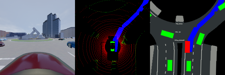 - 我们提供一个字典形式的观测值,包括前视摄像头图像 (obs['camera'])、鸟瞰视角的激光雷达点云 (obs['lidar'])以及鸟瞰视角的语义表示 (obs['birdeye']):