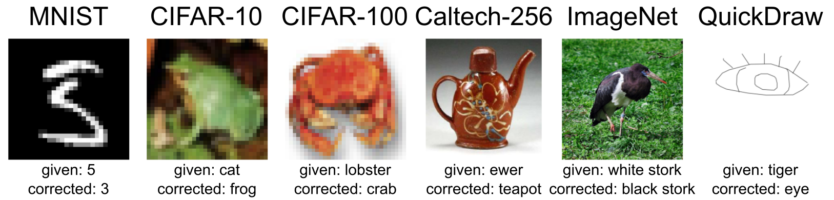 使用 cleanlab 找到并修正的各类图像数据集中错误标注的示例。虽然这些例子来自图像数据集,但该方法同样适用于文本、音频和表格数据。