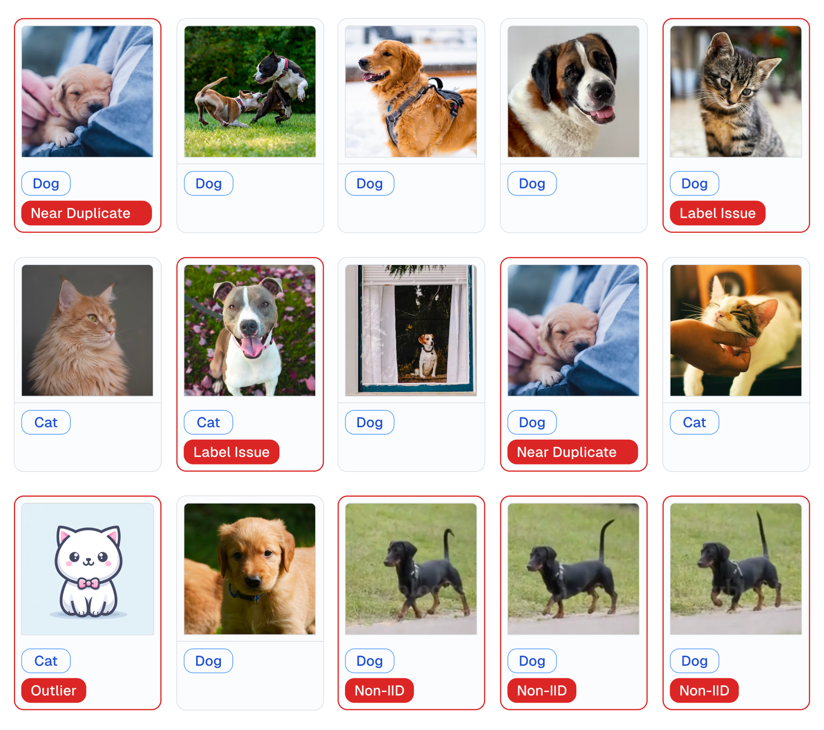 通过这段代码,Cleanlab 可以自动检测猫狗数据集中存在的各种问题: