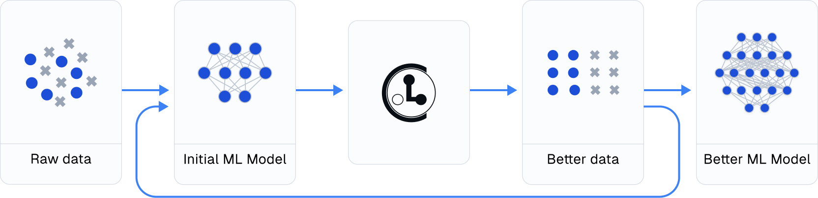大多数人通常直接从步骤 1 跳到步骤 4,但您只需使用 Cleanlab,无需对建模代码做任何修改,就能获得显著收益!通过不断迭代步骤 2 至 4 来持续提升性能(并尽量使用清理后的数据进行评估)。