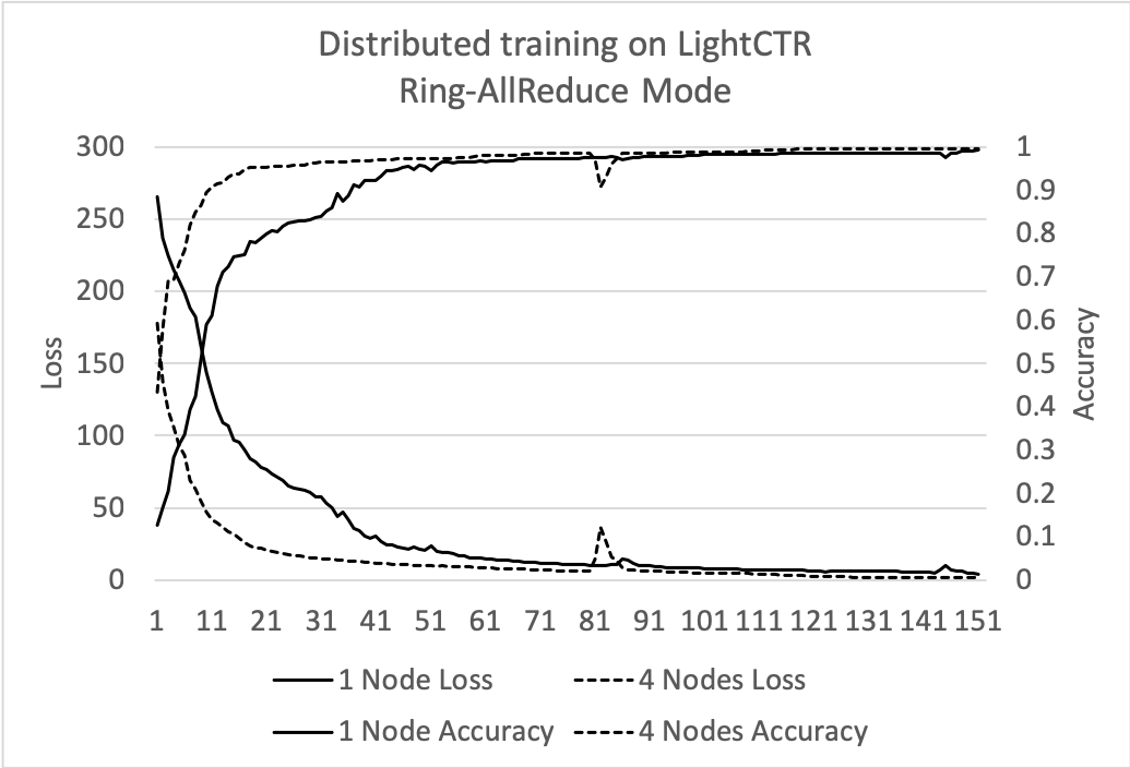 - 环拓扑Ring-AllReduce模式下,LightCTR在不引入协调节点下实现集群训练进度的动态自平衡,结合梯度融合机制,实现了高效、高稳定性的去中心化梯度同步,适合稠密参数模型的可扩展训练;在这种模式下每个节点存储全量模型可单独提供推理预测能力,训练过程通过有限次迭代获取其他节点梯度结果,在一定集群规模与合适的Batch size、学习率设置下可实现训练任务的线性加速比。