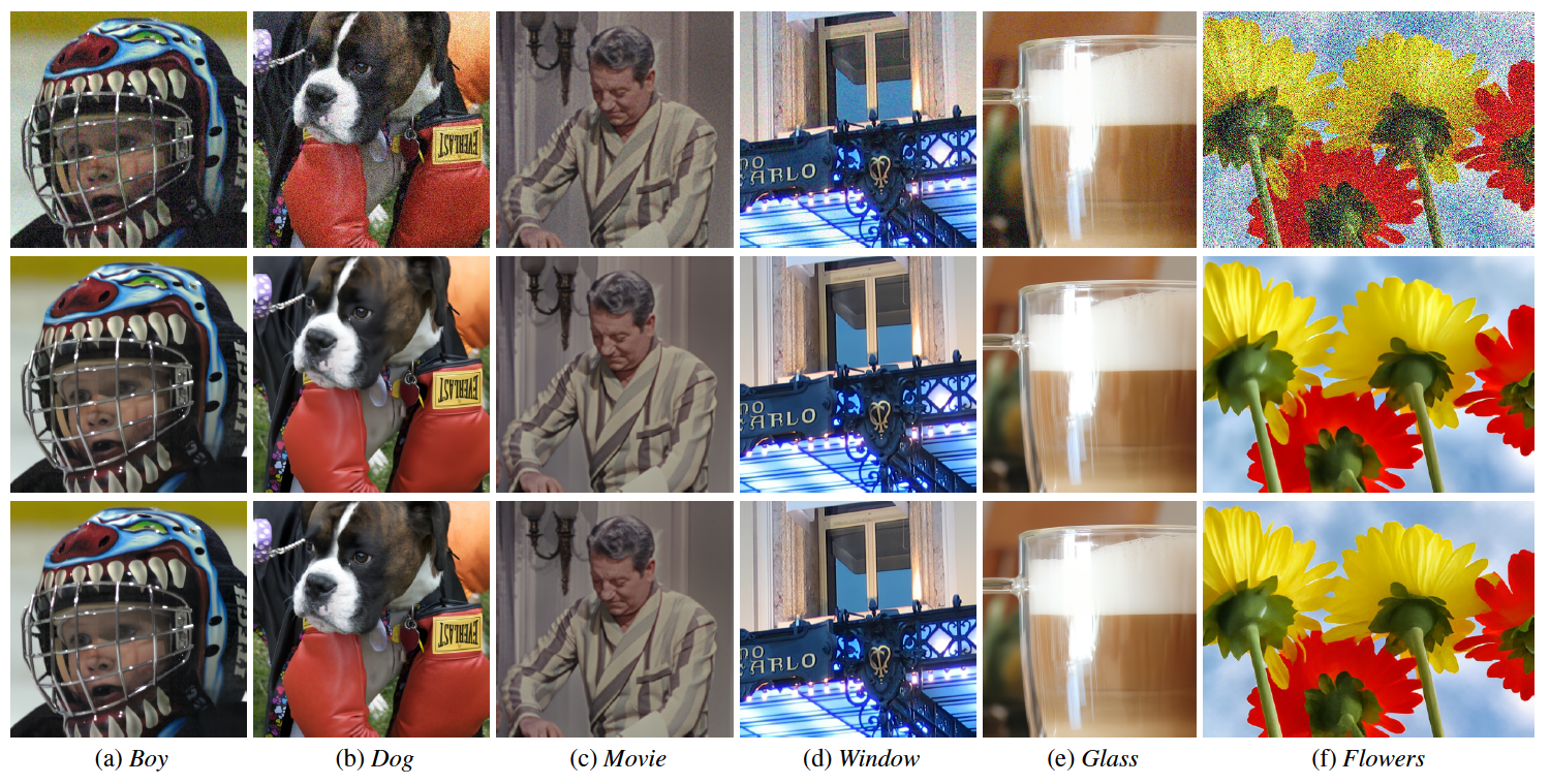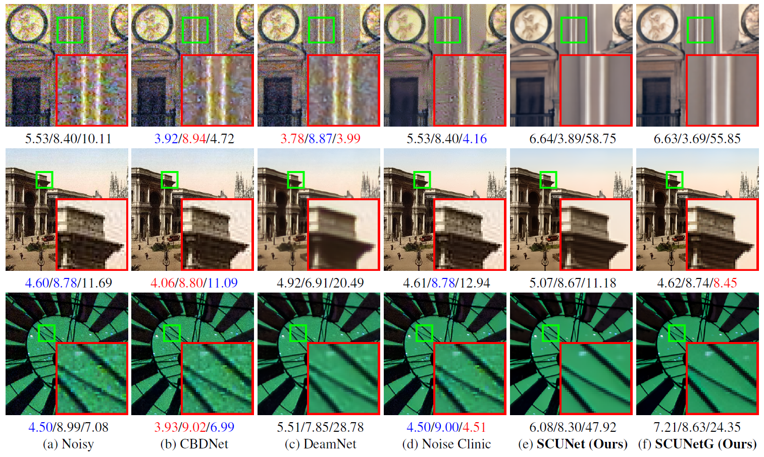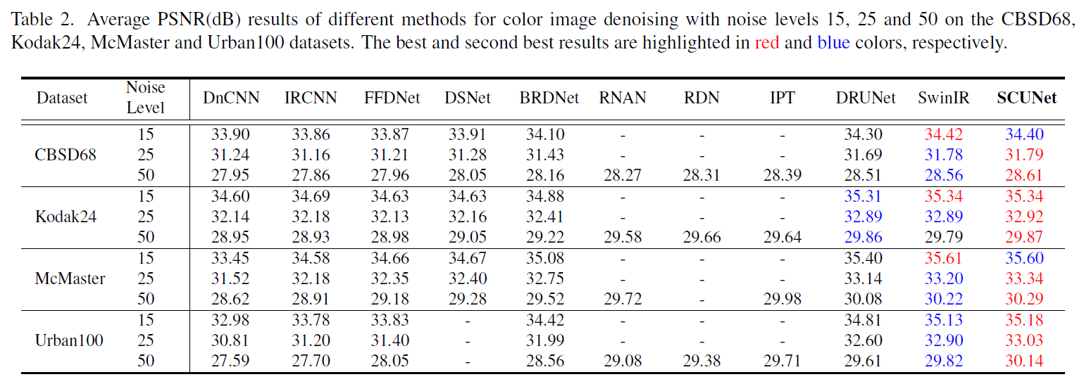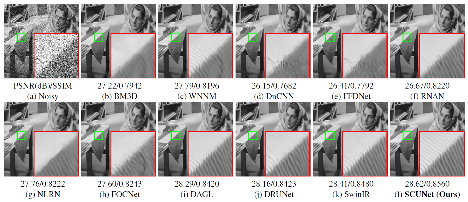 以下结果是通过我们的SCUNet模型使用纯合成训练数据获得的! 我们在训练过程中并未使用DND和SIDD的配对噪声/干净数据!