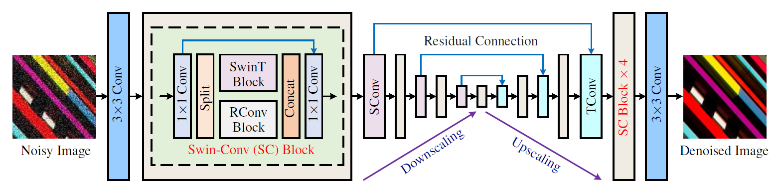 提出的Swin-Conv-UNet(SCUNet)去噪网络的架构。SCUNet将Swin-Conv(SC)块作为UNet主干网络的主要构建块。在每个SC块中,输入首先通过1×1卷积,随后被均分为两个特征图组,每个组分别输入Swin Transformer(SwinT)块和残差3×3卷积(RConv)块;之后,SwinT块和RConv块的输出被拼接并经过1×1卷积以生成输入的残差。“SConv”和“TConv”分别表示步长为2的2×2卷积和步长为2的2×2转置卷积。