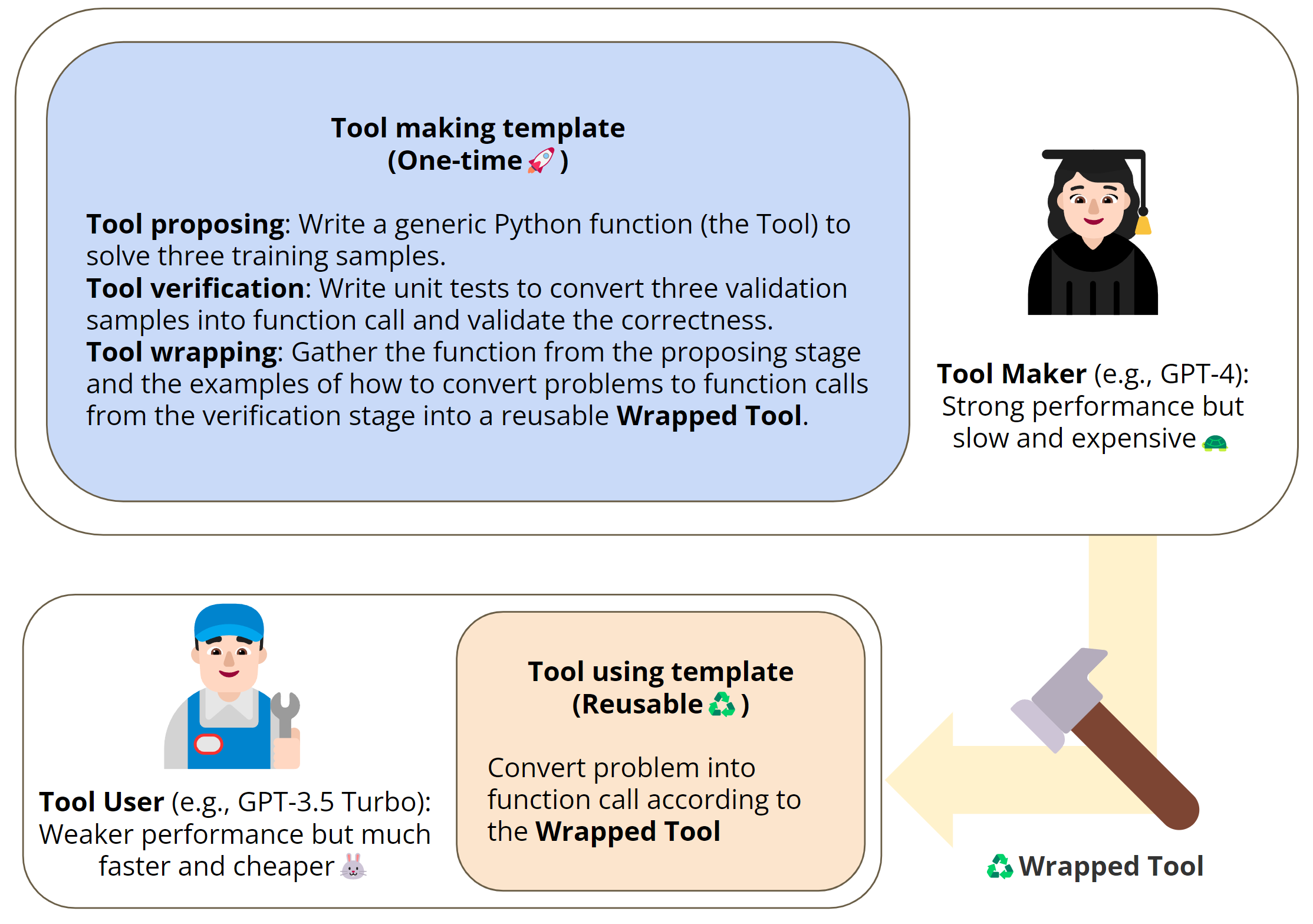 该项目主要解决了大模型在处理复杂推理任务时,因缺乏专用工具而导致能力受限或成本过高的问题。其核心亮点在于独特的“分工协作”机制:将流程分为“制造”与“使用”两个阶段。用户可以配置高性能模型(如 GPT-4)担任“制造者”,负责从示例中提炼逻辑、编写代码并通过单元测试验证;随后由轻量级模型(如 GPT-3.5)担任“使用者”,直接调用已验证的工具高效解题。这种策略既保证了解题质量,又显著降低了推理成本。
