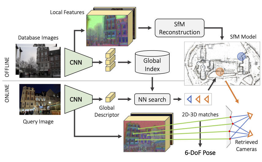 这是 hloc,一个用于最先进的6自由度视觉定位的模块化工具箱。它实现了分层定位,利用图像检索和特征匹配技术,具有速度快、精度高、可扩展性强的特点。该代码库整合并简化了多年来在图像匹配和运动恢复结构(SfM)领域的研究成果。