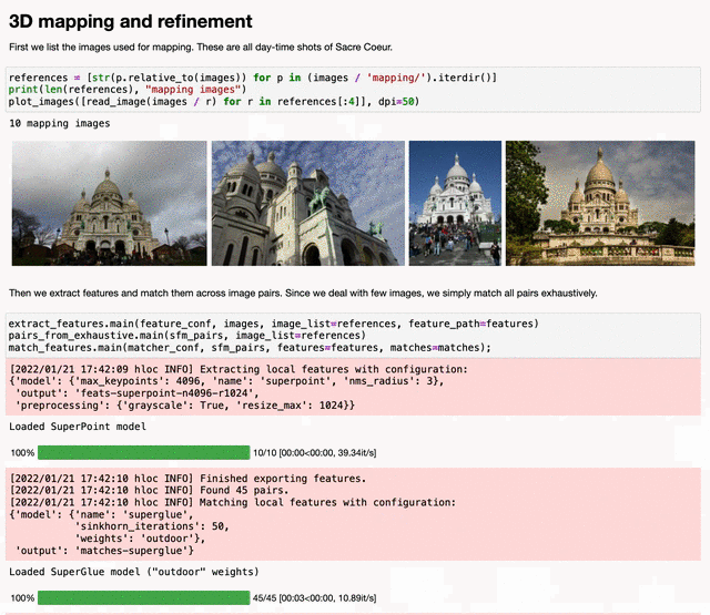 Jupyter 笔记本 demo.ipynb 展示了一个最小化的使用示例。它演示了如何运行运动恢复结构及精炼流程、如何对齐和比较不同的 3D 模型,以及如何对额外的查询图像进行定位并精炼。