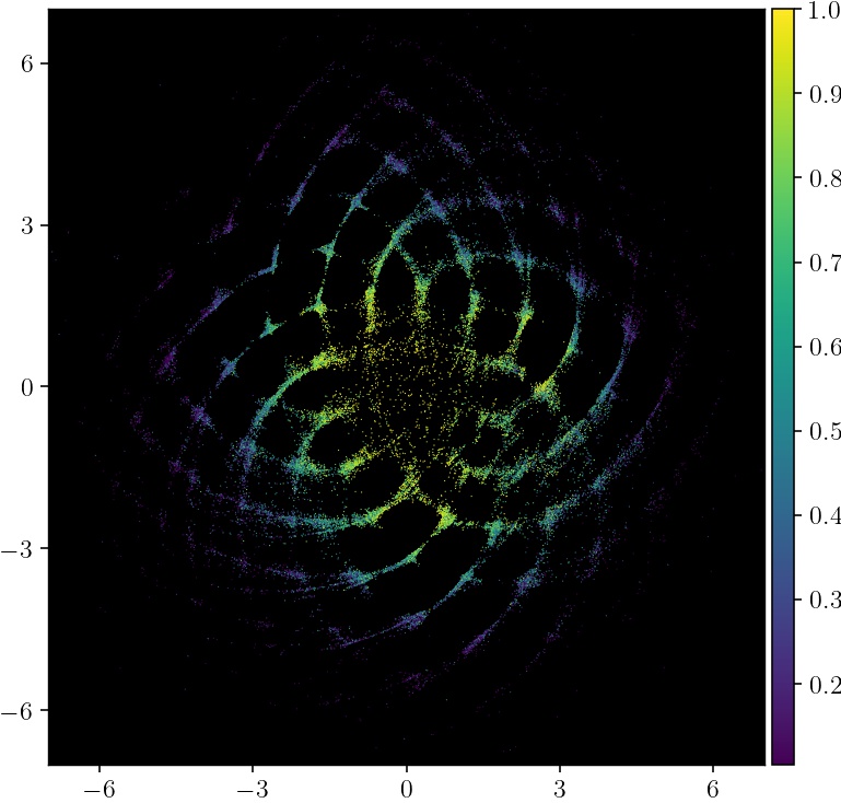 pymde.plot(embedding, color_by=google_scholar.attributes['coauthors'], color_map='viridis', background_color='black')