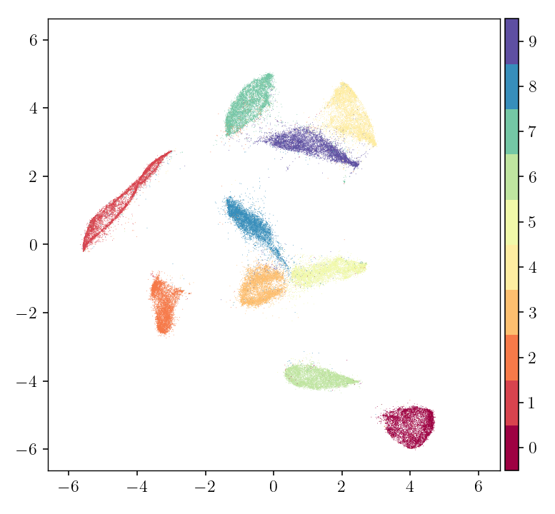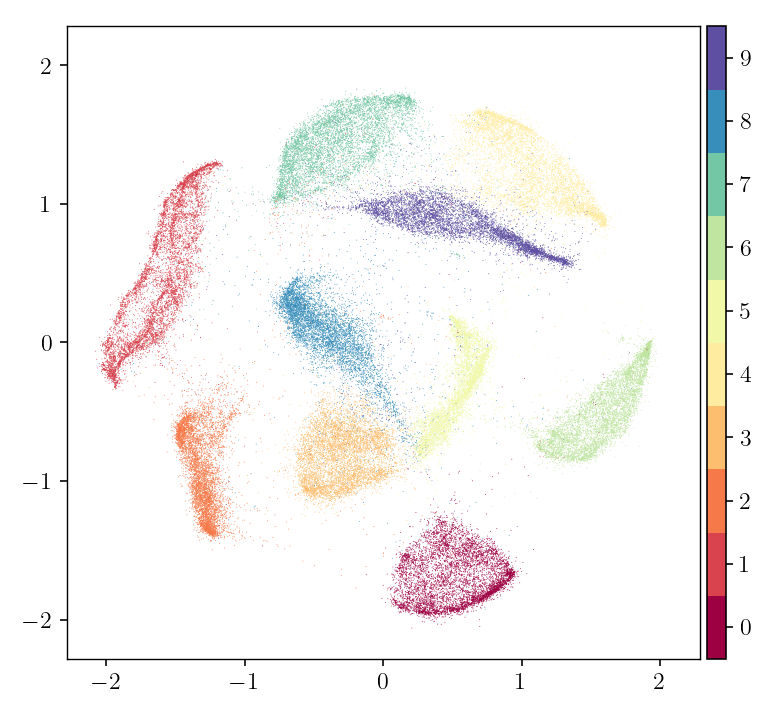 以下代码以类似于 LargeVis、t-SNE、UMAP 等基于邻域的嵌入方式,对 MNIST 数据集(手写数字图像)进行嵌入。原始数据是一个形状为 (70000, 784) 的矩阵,每行代表一张图像。