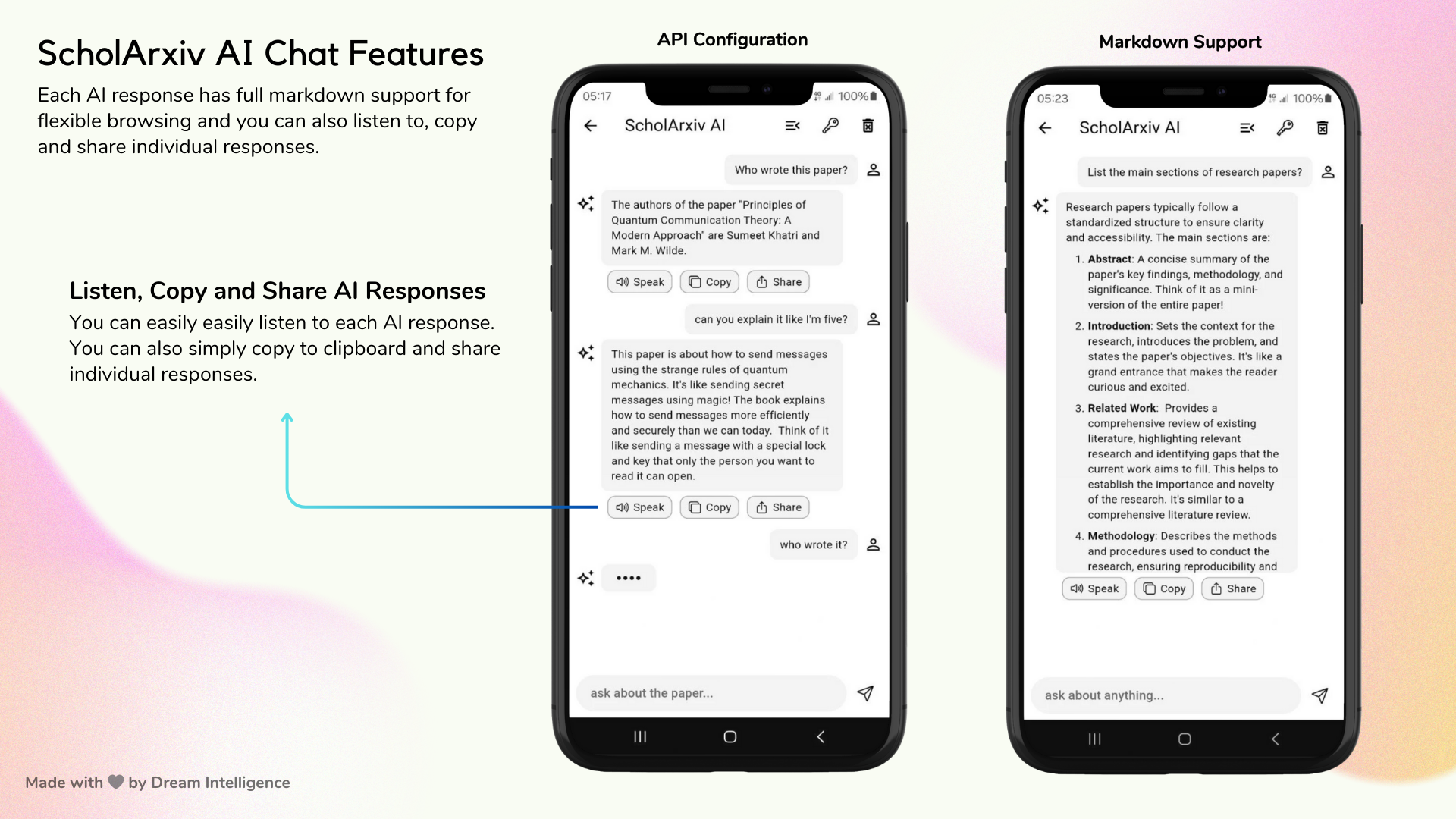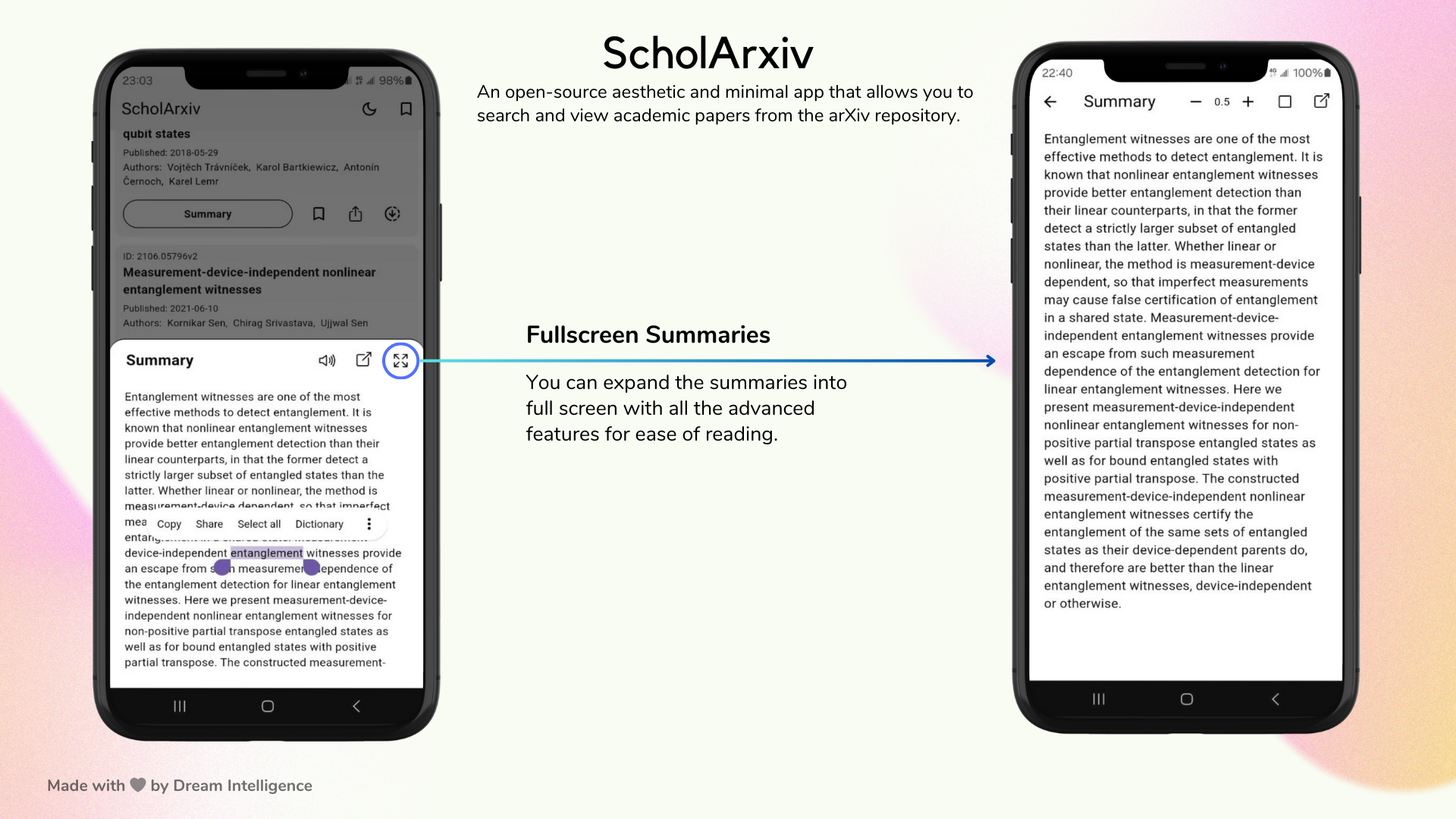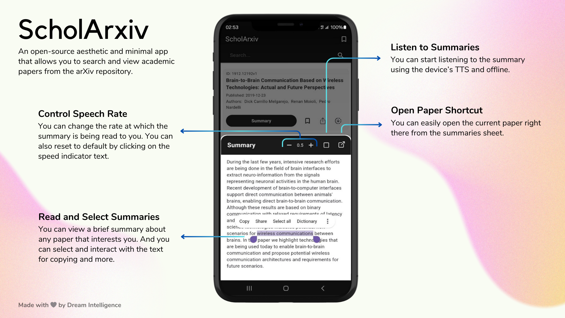ScholArxiv 是一款专为学术爱好者打造的开源移动应用,旨在让查阅 arXiv 论文变得简单而优雅。它解决了传统学术检索工具界面复杂、阅读体验不佳以及难以快速理解深奥内容的痛点。通过极简且美观的设计,用户不仅能轻松搜索、阅读全文、下载离线浏览或收藏心仪的论文,还能一键获取由 AI 生成的论文摘要,甚至支持语音聆听,极大提升了信息获取效率。